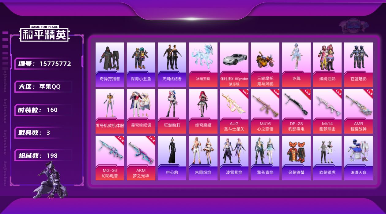 [15775772]苹果 手Q-无敌战神框-7粉装-7特效枪-3载具-1粉色飞行器-65785热力值-15王牌印记-160套装-198枪皮 【热门品类】:粉装-缤纷油彩,绝对防御上衣,套装-浪漫天命,套装-深海小丑鱼,套装-小丑鱼,套装-奇异狩猎者,角色-军刀雅典娜,套装-天网终结者,套装-金羽特工,旭日初心兜帽大衣,套装-粉红小猪 【粉色载具】:保时捷918 Spyder(液态银),鬼马风驰,冰绡玉鳞 【粉色套装】:粉装-缤纷油彩,粉装-苍蓝魅影,角色-零号机款机体服,粉装-星穹咏叹调,角色-狂魅哈莉,角色-绯穹魔姬,角色-冰魄 【粉色枪皮等级】:AKM-梦之光华(四级),M416-心之恋语(六级),AUG-圣斗士星矢(七级),Mk14-甜梦熊击(五级),AMR-智耀战神(五级),DP-28-豹影疾电(五级),MG-36-幻彩电音(五级) 【粉色枪皮】:AKM-梦之光华,M416-心之恋语,AUG-圣斗士星矢,Mk14-甜梦熊击,AMR-智耀战神,DP-28-豹影疾电,MG-36-幻彩电音 【粉色飞行器】:灵珠游龙飞行器 【粉色降落伞】:繁花小夜曲降落伞,环太平洋降落伞,未来歌姬降落伞,智耀战神降落伞,幻彩电音降落伞,双重狂想降落伞,绯穹魔姬降落伞,无垠阁降落伞,魔童闹海 敖丙降落伞 【稀有套装】:套装-粉恋花,套装-紫幽梦,套装-蓝冰羽,套装-霓虹热舞,套装-极速光影,套装-彩虹兔,套装-云朵鹅,套装-雪绒豹,套装-诡诞巡游,角色-绛羽幽主,套装-朱霞炽焰,套装-凌霄紫焰,套装-擎苍青焰,角色-申公豹 【稀有枪皮】:AKM-PEL轰鸣竞梦者,AKM-夜灯,AKM-灼热熔岩,AKM-玉龙,AKM-萌趣颜团子,AKM-霓虹街区,AKM-龙的传人,M16A4-机械英豪,M16A4-莲影清波,SCAR-L-炫彩节奏,SCAR-L-王牌四分卫,SCAR-L-红色方程式,SCAR-L-黄金龙骨,M416-夜灯,M416-神秘黑猫,M416-红色方程式,GROZA-彩虹符号,GROZA-懵萌河马,GROZA-治愈之星,GROZA-黑色刀锋,AUG-炫光贝贝,AUG-终结者,AUG-青春冒险家,QBZ-原初圣火,QBZ-彩虹符号,QBZ-未来歌姬,M762-奇异狩猎者,M762-牛气冲天,M762-绯红前夜,M762-镭射皇者,M762-云朵鹅,Mk47-百万伏特,Mk47-青春冒险家,G36C