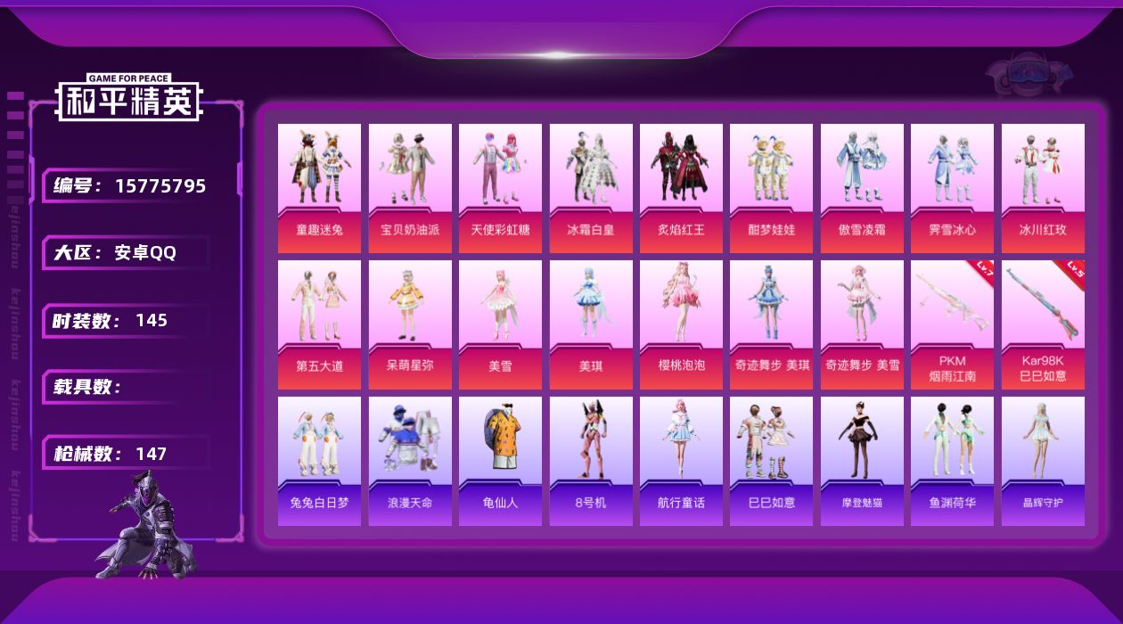 [15775795]安卓 手Q-16粉装-2特效枪-0载具-2粉色飞行器-49650热力值-4王牌印记-145套装-147枪皮