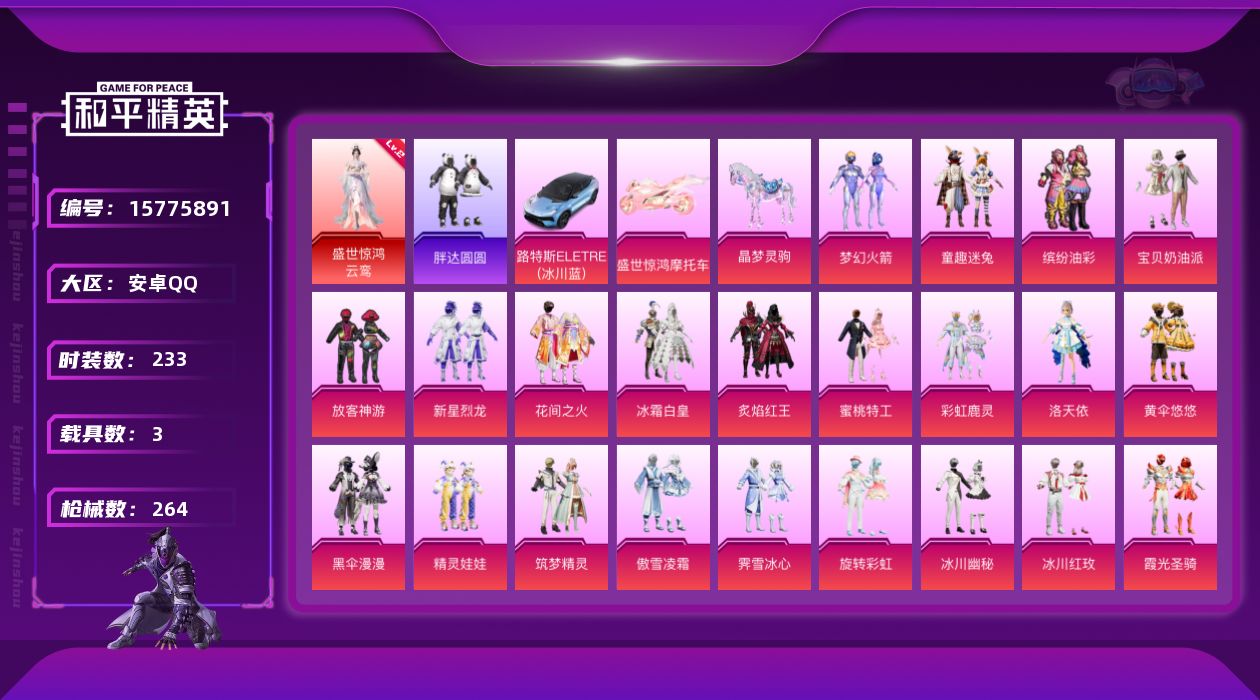 [15775891]安卓 手Q-1神装-33粉装-16特效枪-3载具-6粉色飞行器-101652热力值-15王牌印记-233套装-264枪皮 【红色神装等级】:盛世惊鸿-云鸾(二级) 【红色角色神装】:盛世惊鸿-云鸾 【热门品类】:粉装-梦幻火箭,粉装-童趣迷兔,粉装-缤纷油彩,套装-浪漫天命,套装-胖达圆圆,套装-龟仙人,套装-暗影哥特,套装-粉红小猪,套装-红红火火,套装-糯粉咩咩,套装-红熊茄茄 【粉色载具】:路特斯ELETRE(冰川蓝),盛世惊鸿摩托车,晶梦灵驹 【粉色套装】:粉装-宝贝奶油派,粉装-梦幻火箭,粉装-缤纷油彩,粉装-放客神游,粉装-新星烈龙,粉装-花间之火,粉装-冰霜白皇,粉装-童趣迷兔,粉装-炙焰红王,粉装-蜜桃特工,粉装-彩虹鹿灵,角色-洛天依,粉装-黄伞悠悠,粉装-黑伞漫漫,粉装-精灵娃娃,粉装-筑梦精灵,粉装-傲雪凌霜,粉装-霁雪冰心,粉装-旋转彩虹,粉装-冰川幽秘,粉装-冰川红玫,粉装-霞光圣骑,粉装-寒光使者,粉装-第五大道,粉装-雪梅暗香,超级赛亚人-孙悟空,角色-呆萌星弥,粉装-闲梦青缨,角色-美雪,角色-鸢尾晶梦,粉装-金丰海韵,角色-千金淑猫,粉装-星穹咏叹调 【粉色枪皮等级】:AKM-甜心宝贝(七级),AKM-星际浪客(一级),SCAR-L-甜梦小狐(六级),M416-至情至圣(六级),GROZA-旋转彩虹(四级),UZI-畅跳缤纷(四级),UMP45-相思残雪(五级),Vector-灵感创作师(四级),汤姆逊-冰川粉黛(四级),Kar98K-巳巳如意(五级),Mk14-盛世惊鸿(二级),AMR-智耀战神(一级),M417-第五大道(一级),MG3-洛神天依(五级),爆炸猎弓-雪梅暗香(三级),破片手榴弹-瓶中星球(六级) 【粉色枪皮】:AKM-甜心宝贝,AKM-星际浪客,SCAR-L-甜梦小狐,M416-至情至圣,GROZA-旋转彩虹,UZI-畅跳缤纷,UMP45-相思残雪,Vector-灵感创作师,汤姆逊-冰川粉黛,Kar98K-巳巳如意,Mk14-盛世惊鸿,AMR-智耀战神,M417-第五大道,MG3-洛神天依,爆炸猎弓-雪梅暗香,破片手榴弹-瓶中星球 【粉色飞行器】:酣梦熊熊飞行器,梦幻火箭飞行器,天之羽翼飞行器,璀璨巨星飞行器,凤舞九天飞行器,圣域金龙飞行器 【粉色降落伞】:春暖花开降落伞,梦幻火箭降落伞,童趣迷兔降落伞,林间仙