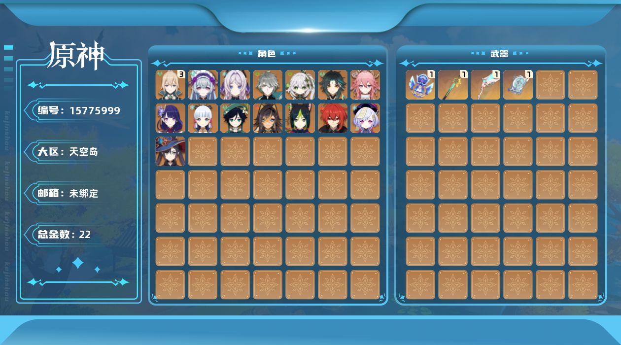 0命迪希雅,0命艾尔海森,0命纳西妲,0命提纳里,0命八重神子,0命雷电将军,0命神里绫华,0命魈,0命温迪,0命七七,3命琴,0命莫娜,0命迪卢克,0命茜特菈莉,0命梦见月瑞希,精1四风原典,精1天空之翼,精1岩峰巡歌,精1祭星者之望