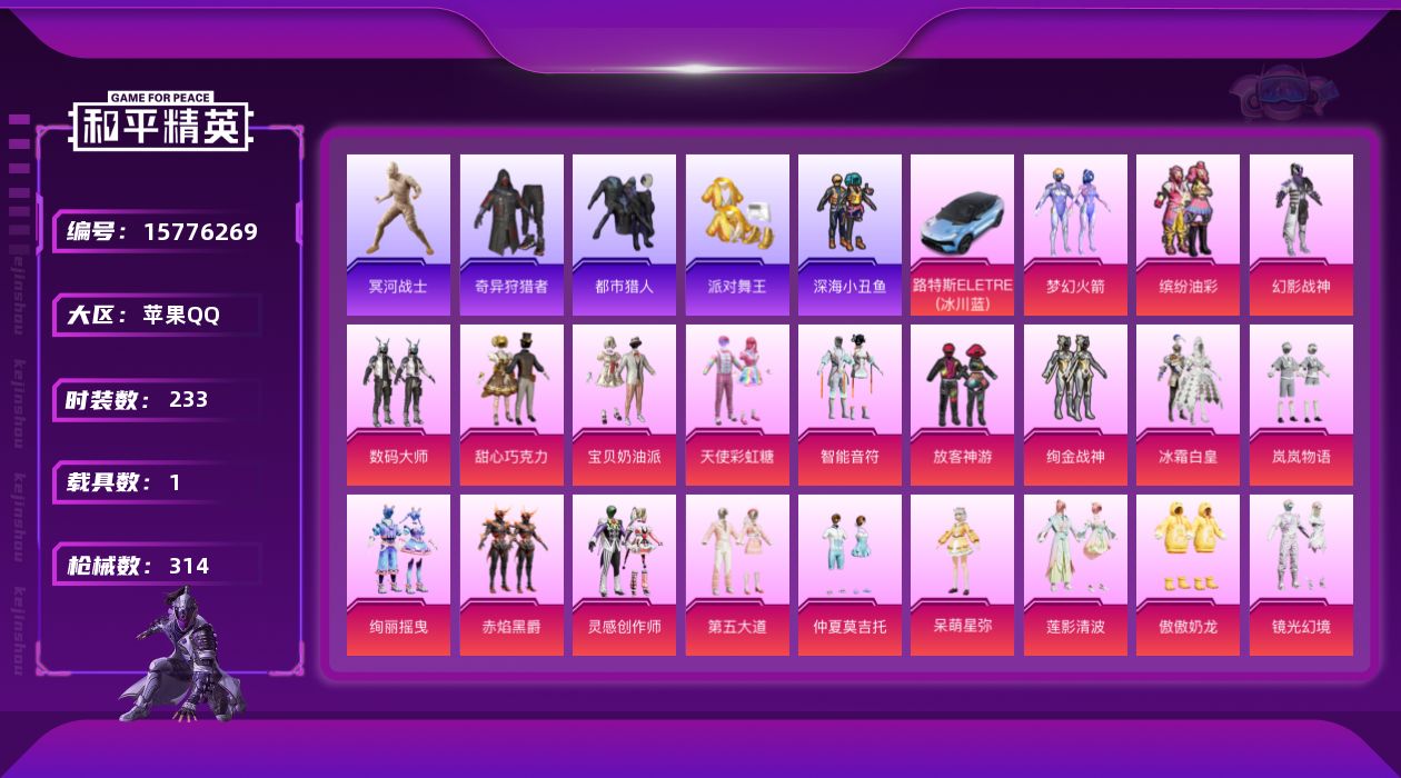 [15776269]苹果 手Q-23粉装-14特效枪-1载具-10粉色飞行器-103457热力值-17王牌印记-233套装-314枪皮 【热门品类】:粉装-梦幻火箭,粉装-缤纷油彩,套装-浪漫天命,套装-都市猎人,套装-冥河战士,套装-派对舞王,套装-深海小丑鱼,套装-小丑鱼,套装-奇异狩猎者,角色-2B战斗服款,角色-忠猛周仓,角色-忠真马岱,角色-忠义严颜,套装-龟仙人,套装-暗影哥特,角色-8号机,角色-Mark.06,大砍刀-青龙偃月刀 【粉色载具】:路特斯ELETRE(冰川蓝) 【粉色套装】:粉装-幻影战神,粉装-数码大师,粉装-甜心巧克力,粉装-宝贝奶油派,粉装-天使彩虹糖,粉装-梦幻火箭,粉装-智能音符,粉装-缤纷油彩,粉装-放客神游,粉装-绚金战神,粉装-冰霜白皇,粉装-岚岚物语,粉装-绚丽摇曳,粉装-赤焰黑爵,粉装-灵感创作师,粉装-第五大道,粉装-仲夏莫吉托,角色-呆萌星弥,粉装-莲影清波,粉装-傲傲奶龙,粉装-镜光幻境,角色-烟云彩露,粉装-星穹咏叹调 【粉色枪皮等级】:AKM-梦之光华(五级),M416-五爪金龙(六级),M416-心之恋语(七级),M416-风花雪月(一级),M416-电玩时刻(五级),AUG-暖羊咩咩(五级),UMP45-量子极限(五级),Vector-最终圣卫者(三级),汤姆逊-星月云朵(二级MK12-雪月幻音),P90-金丰海韵(五级),Kar98K-巳巳如意(五级),M417-第五大道(五级),DP-28-豹影疾电(五级),破片手榴弹-美味星星糖(六级) 【粉色枪皮】:AKM-梦之光华,M416-五爪金龙,M416-心之恋语,M416-风花雪月,M416-电玩时刻,AUG-暖羊咩咩,UMP45-量子极限,Vector-最终圣卫者,P90-金丰海韵,Kar98K-巳巳如意,M417-第五大道,MK12-雪月幻音,DP-28-豹影疾电,破片手榴弹-美味星星糖 【粉色飞行器】:梦幻火箭飞行器,拂晓神骑飞行器,沙丘之主天马,镜域双华-灵镜之阶,霓虹漫游飞行器,星空武士飞行器,龙翔九天飞行器,英伦信使飞行器,彩虹独角兽飞行器,桃源时光飞行器 【粉色降落伞】:极限特训降落伞,快乐主宰降落伞,幻影战神降落伞,甜心宝贝降落伞,至尊龙雀降落伞,梦幻火箭降落伞,甜蜜誓约降落伞,洛神天依降落伞,焦糖拿铁降落伞,恐龙拽拽降落伞,青空秋雨降落伞,音爆索尼克降落
