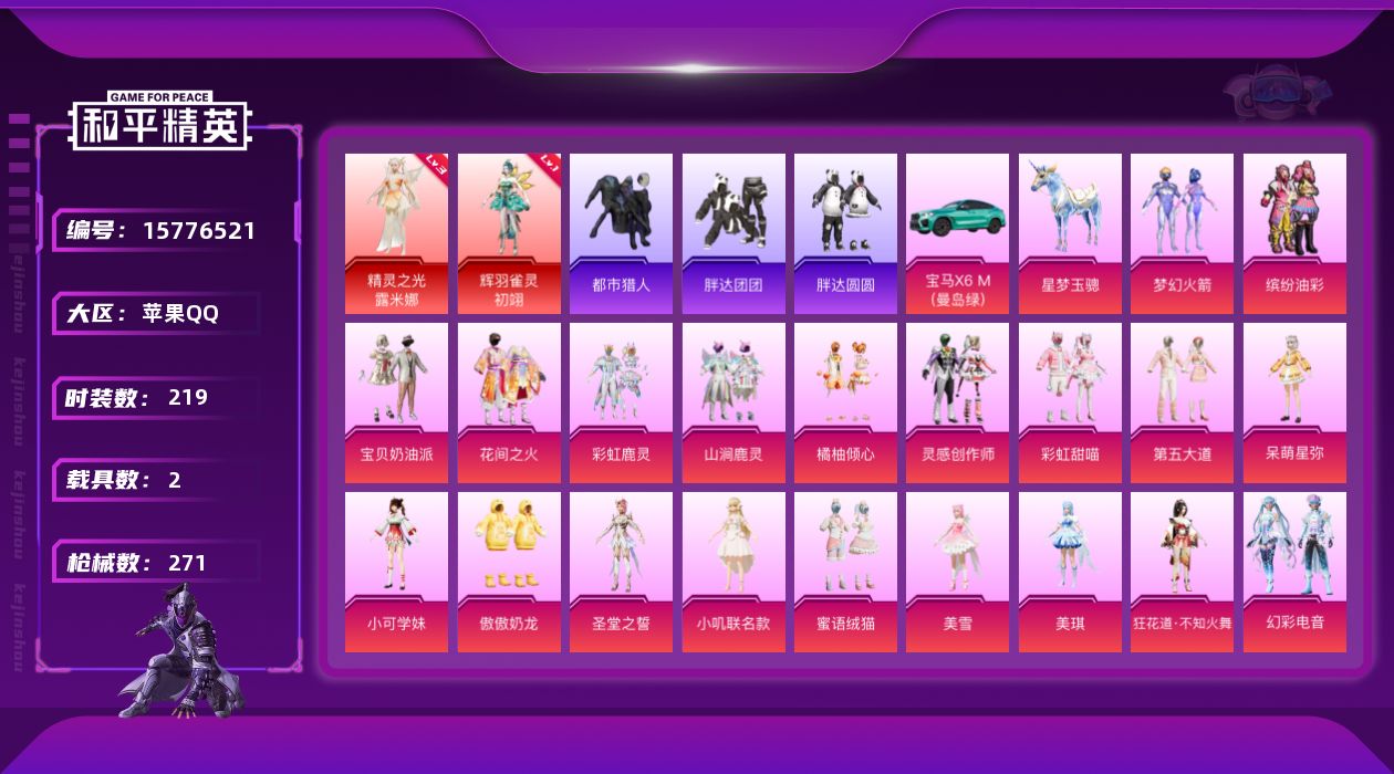 [15776521]苹果 手Q-2神装-20粉装-15特效枪-2载具-10粉色飞行器-100757热力值-14王牌印记-219套装-271枪皮