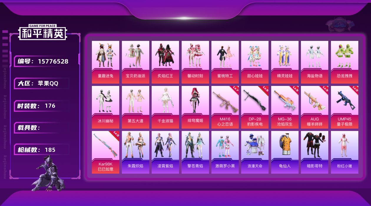 [15776528]苹果 手Q-13粉装-6特效枪-2粉色飞行器-65559热力值-10王牌印记-176套装-185枪皮 【热门品类】:粉装-童趣迷兔,套装-浪漫天命,套装-龟仙人,套装-暗影哥特,套装-粉红小猪,套装-糯粉咩咩,套装-红熊茄茄 【粉色套装】:粉装-宝贝奶油派,粉装-童趣迷兔,粉装-炙焰红王,粉装-馨动时刻,粉装-蜜桃特工,粉装-甜心娃娃,粉装-精灵娃娃,粉装-海盐物语,粉装-恐龙拽拽,粉装-冰川幽秘,粉装-第五大道,角色-千金淑猫,角色-绯穹魔姬 【粉色枪皮等级】:M416-心之恋语(七级),AUG-暖羊咩咩(五级),UMP45-量子极限(五级),Kar98K-巳巳如意(五级),DP-28-豹影疾电(五级),MG-36-沧焰双生(五级) 【粉色枪皮】:M416-心之恋语,AUG-暖羊咩咩,UMP45-量子极限,Kar98K-巳巳如意,DP-28-豹影疾电,MG-36-沧焰双生 【粉色飞行器】:春暖花开飞行器,梦幻舞会飞行器 【粉色降落伞】:春暖花开降落伞,神秘黑猫降落伞,甜蜜誓约降落伞,垂柳戏鸭降落伞,第五大道降落伞,飒粉甜心降落伞,蜜语绒猫降落伞,精灵梦叶罗丽降落伞,金丰海韵降落伞,幻梦之森降落伞,桃粉嫣然降落伞,荧海星豚降落伞,绯穹魔姬降落伞,喜羊羊与灰太狼降落伞 【稀有套装】:套装-龟仙人,套装-航行童话,套装-巳巳如意,套装-雏菊兔兔,套装-萝兰蝴蝶,套装-小熊娃娃,套装-糖糖葫芦,套装-青团波波,套装-棉花软糖,角色-都市丽猫,套装-燕燕于飞,套装-鱼渊荷华,套装-晶辉守护,套装-粉恋花,套装-紫幽梦,套装-蓝冰羽,套装-彩虹兔,套装-云朵鹅,套装-雪绒豹,套装-蜜露汐语,角色-绛羽幽主,角色-夜瞳黯灵,套装-朱霞炽焰,套装-凌霄紫焰,套装-擎苍青焰 【稀有枪皮】:AKM-彩虹符号,AKM-春暖花开,AKM-生命誓言,AKM-龙的传人,M16A4-幻世战舞者,M16A4-甜心亚梦,M16A4-千金淑猫,SCAR-L-暗夜玫瑰,SCAR-L-炫彩节奏,SCAR-L-玉兔迎春,M416-糯团青竹,M416-红色方程式,M416-蓝色火焰,GROZA-异彩先驱,GROZA-春暖花开,GROZA-蓝莓炮弹,AUG-天降萌叽,AUG-耀粉歌者,QBZ-神秘黑猫,M762-天降萌叽,M762-彩虹甜喵,M762-甜心宝贝,M762-第五大道,M762-云朵鹅,Mk47