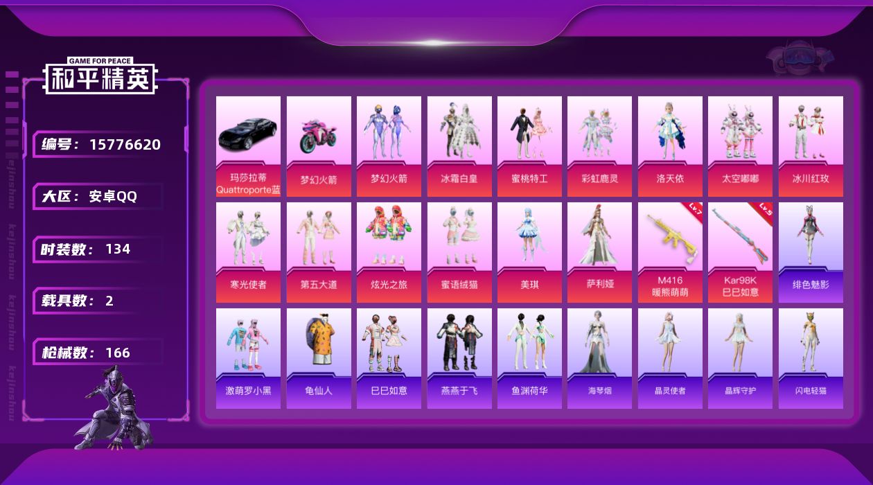 [15776620]安卓 手Q-13粉装-2特效枪-2载具-3粉色飞行器-56910热力值-3王牌印记-134套装-166枪皮