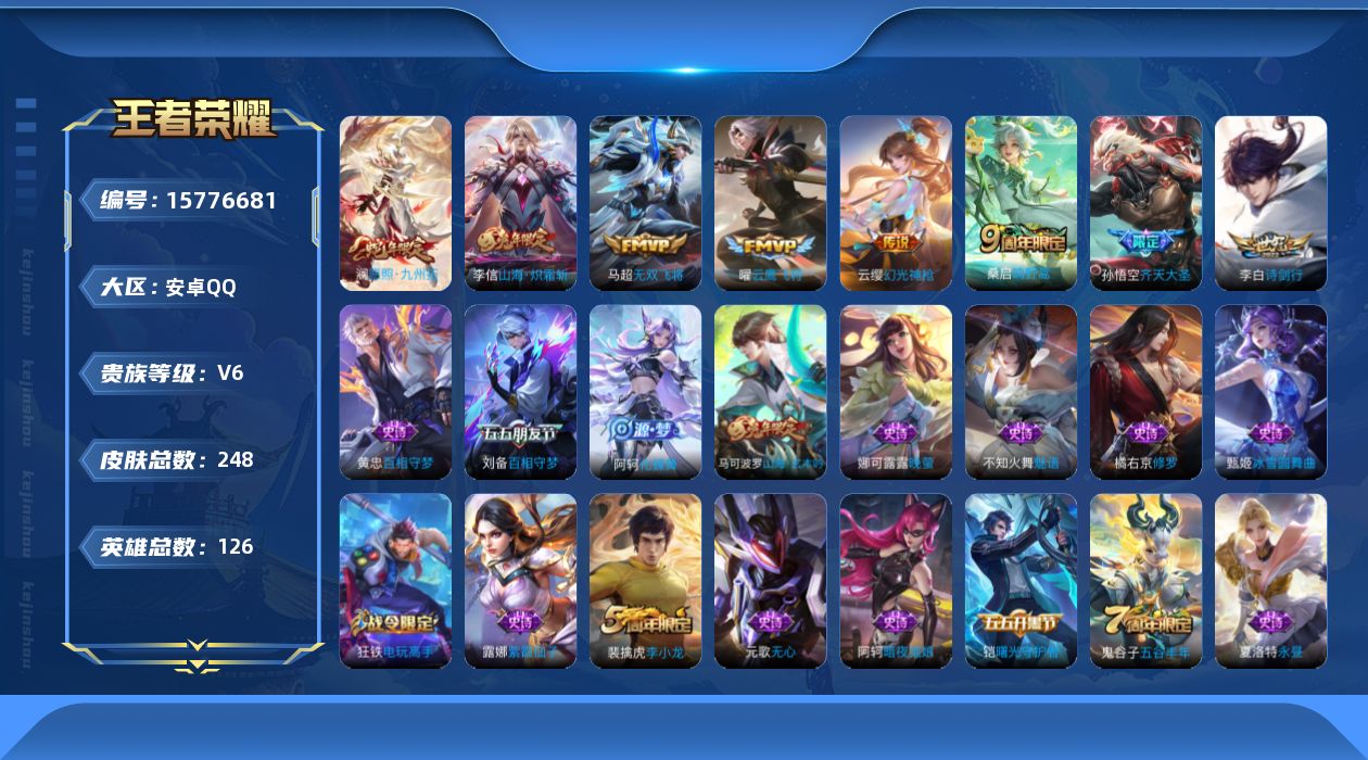 [15776681]安卓Q-V6-至尊星耀V段位-126英雄-248皮肤-0典藏-0珍品无双-0无双-0珍品传说-8传说-66史诗