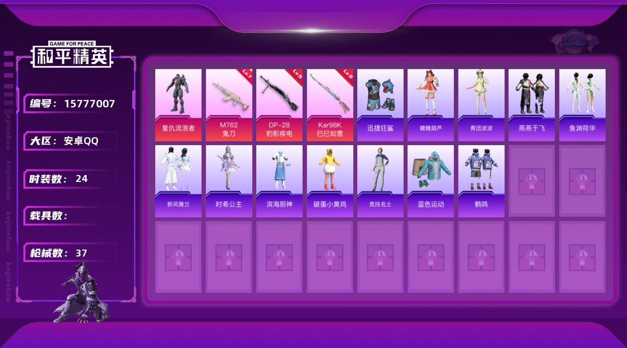 [15777007]安卓 手Q-2粉装-3特效枪-0载具-0粉色飞行器-13276热力值-1王牌印记-24套装-37枪皮 【粉色套装】:角色-复仇流浪者 【粉色枪皮等级】:M762-鬼刀(七级),Kar98K-巳巳如意(五级),DP-28-豹影疾电(五级) 【粉色枪皮】:M762-鬼刀,Kar98K-巳巳如意,DP-28-豹影疾电 【粉色降落伞】:千金淑猫降落伞,樱桃泡泡降落伞,星穹咏叹调降落伞 【稀有套装】:套装-糖糖葫芦,套装-青团波波,套装-燕燕于飞,套装-鱼渊荷华,套装-新风雅兰,角色-时希公主 【稀有枪皮】:M16A4-千金淑猫,SCAR-L-炫彩节奏,AC-VAL-天降萌叽,UZI-幻影飞狐,Mini14-绯穹魔姬,S1897-荧海星豚,S12K-玩趣呆呆,DBS-彩虹符号,DP-28-彩虹独角兽,蝎式手枪-千金淑猫,爆炸猎弓-雪月幻音 【其他套装】:套装-滨海厨神,套装-破蛋小黄鸡,套装-竞技名士,套装-蓝色运动,套装-鹤鸣,套装-迅捷狂鲨 【稀有背包】:金羽特工背包(1级) 【营地ID】:980309847