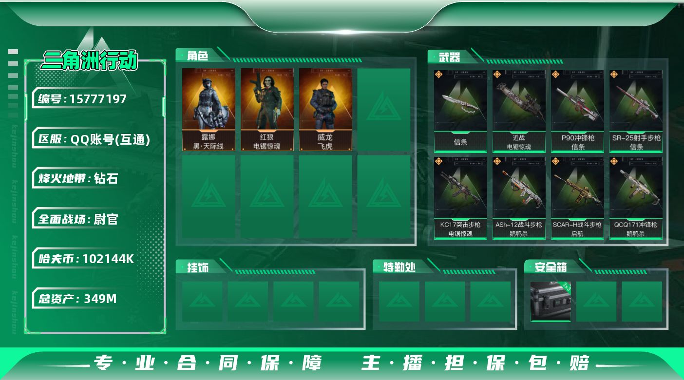 [15777197]【特价出售/店主推荐】349m总资产-102144k哈伏币-60烽火等级-钻石-40战场等级-尉官 【干员外观】:露娜-黑·天际线,威龙-飞虎,红狼-电锯惊魂 【近战皮肤】:近战-电锯惊魂,近战-信条,近战-黑鹰 【传说外观】:M4A1突击步枪-阿米娅,ASh-12战斗步枪-鹅鸭杀,M7战斗步枪-零度协议,AK-12突击步枪-特斯拉线圈,SCAR-H战斗步枪-启航,CAR-15突击步枪-阿米娅,腾龙突击步枪-捞点薯条,KC17突击步枪-电锯惊魂,P90冲锋枪-信条,UZI冲锋枪-特斯拉线圈,SMG-45冲锋枪-骑士,SR-3M紧凑突击步枪-特斯拉线圈,勇士冲锋枪-能天使-午夜邮差,QCQ171冲锋枪-鹅鸭杀,S12K霰弹枪-电锯惊魂,QJB201轻机枪-鹅鸭杀,M14射手步枪-电锯惊魂,SR-25射手步枪-信条,AWM狙击步枪-捞点薯条,93R-捞点薯条,复合弓-黑·天际线 【史诗外观】:AKM突击步枪-林中猎手,M16A4突击步枪-竞赛选手,AUG突击步枪-蝮蛇,SCAR-H战斗步枪-囚徒,腾龙突击步枪-猎鳄行动,MP5冲锋枪-深海恐惧,MP5冲锋枪-战术竞备,MP5冲锋枪-竞技风,Vector冲锋枪-猎鳄行动,Vector冲锋枪-异域战争,SR-3M紧凑突击步枪-战术竞备,勇士冲锋枪-深海恐惧,勇士冲锋枪-工业狂潮,M1014霰弹枪-林中猎手,S12K霰弹枪-曙光,PKM通用机枪-蝮蛇,SVD狙击步枪-阿萨拉工艺,SVD狙击步枪-暗夜猎手,SV-98狙击步枪-林中猎手,SV-98狙击步枪-囚徒,SV-98狙击步枪-猎鳄行动,M700狙击步枪-竞技风,M700狙击步枪-蝮蛇,M700狙击步枪-哈夫克警备,沙漠之鹰-曙光 【稀有外观】:AKM突击步枪-青纹,QBZ95-1突击步枪-花岗岩,M1014霰弹枪-花岗岩,PKM通用机枪-黑潮,SG552突击步枪-天际线,AK-12突击步枪-极地勘察队,M700狙击步枪-旧梦,AKM突击步枪-浅鲨小队,AKM突击步枪-肃杀,QBZ95-1突击步枪-公平竞技,AKS-74U突击步枪-前沿科技,ASh-12战斗步枪-星链科技,ASh-12战斗步枪-哈夫克航天,M16A4突击步枪-街头涂鸦,AUG突击步枪-指挥官,AUG突击步枪-全金属外壳,M7战斗步枪-捣蛋鬼,SCAR-H战斗步枪-童趣,SCAR-H战斗步枪-荣耀列队,PTR