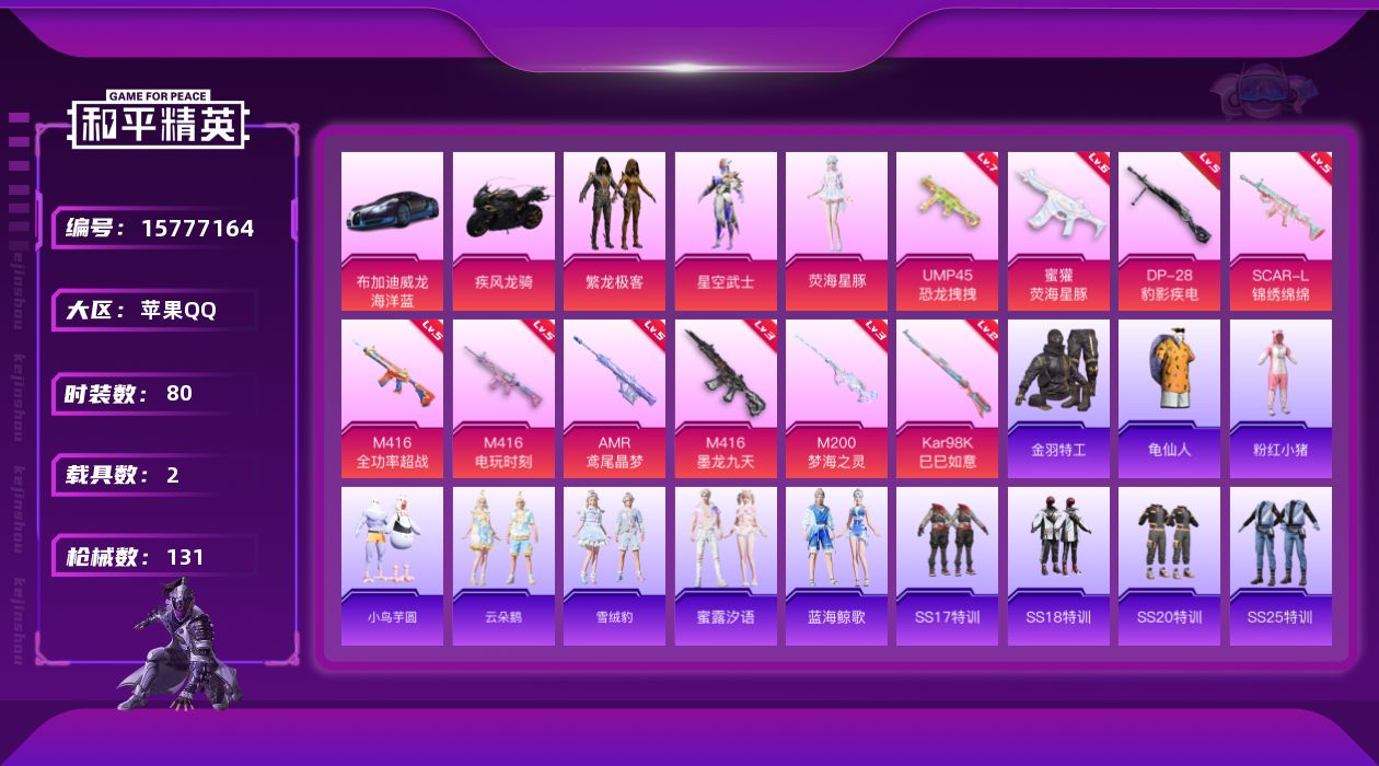 [15777164]苹果 手Q-无敌战神框-3粉装-10特效枪-2载具-5粉色飞行器-45959热力值-6王牌印记-80套装-131枪皮 【热门品类】:粉装-繁龙极客,套装-金羽特工,套装-龟仙人,套装-粉红小猪 【粉色载具】:布加迪威龙(海洋蓝),疾风龙骑 【粉色套装】:粉装-繁龙极客,角色-星空武士,角色-荧海星豚 【粉色枪皮等级】:SCAR-L-锦绣绵绵(五级),M416-全功率超战(五级),M416-电玩时刻(五级),M416-墨龙九天(三级),蜜獾-荧海星豚(六级),UMP45-恐龙拽拽(七级),Kar98K-巳巳如意(二级),AMR-鸢尾晶梦(五级),M200-梦海之灵(三级),DP-28-豹影疾电(五级) 【粉色枪皮】:SCAR-L-锦绣绵绵,M416-全功率超战,M416-电玩时刻,M416-墨龙九天,蜜獾-荧海星豚,UMP45-恐龙拽拽,Kar98K-巳巳如意,AMR-鸢尾晶梦,M200-梦海之灵,DP-28-豹影疾电 【粉色飞行器】:繁龙极客飞行器,星空武士飞行器,龙翔九天飞行器,幻海精灵飞行器 【粉色降落伞】:怪笑疯兔降落伞,龙珠超降落伞,超新星降落伞,莲影清波降落伞,繁龙极客降落伞,江南烟雨降落伞,电糖天使降落伞,星空武士降落伞,精灵梦叶罗丽降落伞,墨龙九天降落伞,荧海星豚降落伞,喜羊羊与灰太狼降落伞 【稀有套装】:套装-龟仙人,套装-小鸟芋圆,套装-云朵鹅,套装-雪绒豹,套装-蜜露汐语,套装-蓝海鲸歌 【稀有枪皮】:AKM-恐龙拽拽,AKM-江南烟雨,AKM-破晓战魂,AKM-萌趣颜团子,AKM-虎虎生威,M16A4-幻世战舞者,M16A4-莲影清波,M416-糯团青竹,M416-蓝色火焰,GROZA-异彩先驱,GROZA-荧海星豚,AUG-天降萌叽,AUG-耀粉歌者,M762-瑞龙福将,M762-云朵鹅,G36C-六号树人,G36C-时空追击者,AC-VAL-快闪甜心,蜜獾-天降萌叽,Famas-墨龙九天,UZI-炫彩节奏,UMP45-繁龙极客,UMP45-时空追击者,UMP45-海渊国主,Vector-焰鹰斗篷,Vector-生命誓言,汤姆逊-异彩先驱,汤姆逊-炫彩节奏,MP5K-异彩先驱,P90-快闪甜心,Kar98K-影袭,AWM-焰鹰斗篷,AWM-恐龙拽拽,SKS-时空追击者,SKS-炫彩节奏,SKS-迅猛狂鲨,VSS-星之彼岸,Mini14-异彩