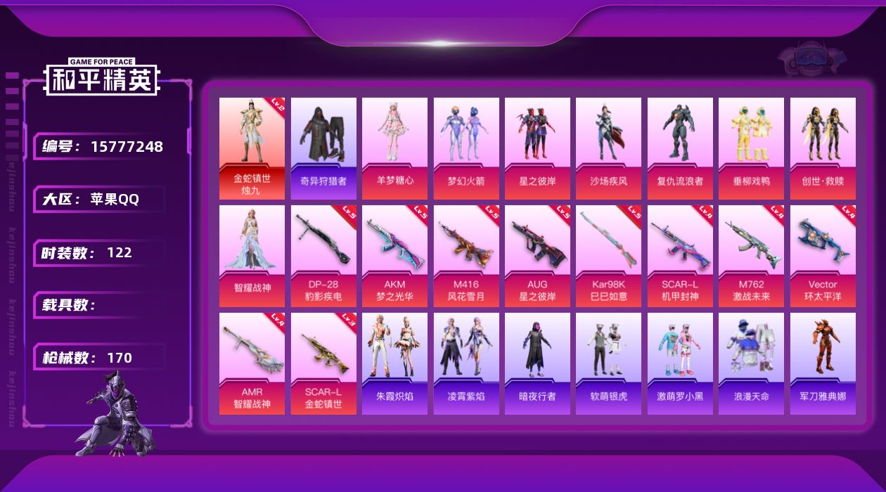 [15777248]苹果 手Q-1神装-8粉装-10特效枪-0载具-2粉色飞行器-57325热力值-10王牌印记-122套装-170枪皮 【红色神装等级】:金蛇镇世-烛九(二级) 【红色角色神装】:金蛇镇世-烛九 【热门品类】:粉装-梦幻火箭,套装-浪漫天命,套装-奇异狩猎者,角色-军刀雅典娜,套装-暗夜行者,套装-暗影哥特 【粉色套装】:粉装-梦幻火箭,粉装-星之彼岸,粉装-沙场疾风,角色-复仇流浪者,粉装-垂柳戏鸭,套装-创世·救赎,角色-智耀战神,角色-羊梦糖心 【粉色枪皮等级】:AKM-梦之光华(五级),SCAR-L-机甲封神(四级),SCAR-L-金蛇镇世(三级),M416-风花雪月(五级),AUG-星之彼岸(五级),M762-激战未来(四级),Vector-环太平洋(四级),Kar98K-巳巳如意(五级),AMR-智耀战神(四级),DP-28-豹影疾电(五级) 【粉色枪皮】:AKM-梦之光华,SCAR-L-机甲封神,SCAR-L-金蛇镇世,M416-风花雪月,AUG-星之彼岸,M762-激战未来,Vector-环太平洋,Kar98K-巳巳如意,AMR-智耀战神,DP-28-豹影疾电 【粉色飞行器】:万象金身飞行器,圣域金龙飞行器 【粉色降落伞】:梦幻火箭降落伞,星之彼岸降落伞,恐龙拽拽降落伞,环太平洋降落伞,垂柳戏鸭降落伞,金蛇镇世降落伞,樱桃泡泡降落伞,雪月幻音降落伞,智耀战神降落伞,星穹咏叹调降落伞 【稀有套装】:套装-巳巳如意,套装-燕燕于飞,套装-鱼渊荷华,角色-风玲,套装-旋风灵鼠,角色-糖霜甜心,套装-风舞幻音,套装-粉恋花,套装-紫幽梦,套装-蓝冰羽,套装-星影赞美诗,套装-彩虹兔,套装-云朵鹅,套装-雪绒豹,角色-乐音,套装-蜜露汐语,角色-夜瞳黯灵,套装-朱霞炽焰,套装-凌霄紫焰 【稀有枪皮】:AKM-奇异狩猎者,AKM-彩虹符号,AKM-星之彼岸,AKM-海渊国主,AKM-生命誓言,AKM-虎虎生威,M16A4-甜心亚梦,M16A4-蓝色火焰,SCAR-L-夜灯,SCAR-L-暗夜玫瑰,SCAR-L-玉兔迎春,M416-暗夜行者,M416-绯红前夜,M416-蓝色火焰,GROZA-异彩先驱,GROZA-恐龙拽拽,GROZA-治愈之星,GROZA-田园牧歌,GROZA-蓝莓炮弹,AUG-青春冒险家,AUG-金蛇镇世,M762-奇异狩猎者,M762-瑞龙福