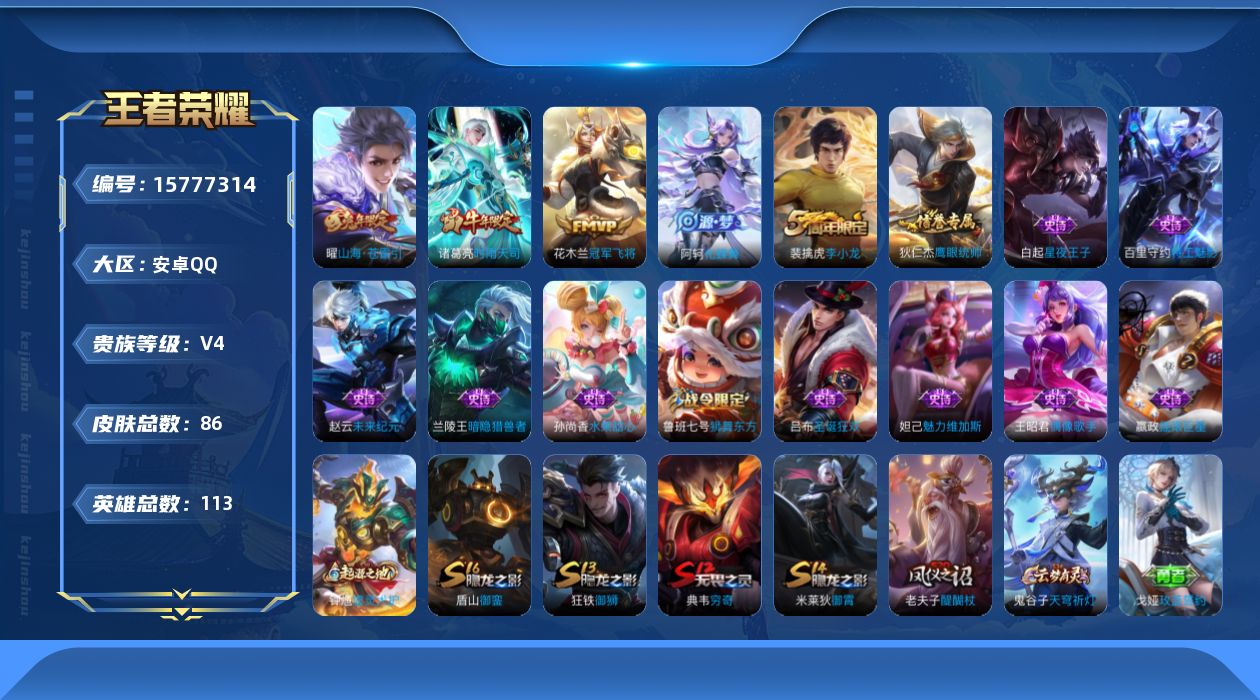 - [11683265]V9 3典藏 2无双 24传说 123英雄 381皮肤 可修改实名 荣耀水晶:银白咏叹调(倪克斯侍卫),无限飓风号(高达),星域神启(倪克斯贼亮) 无双皮:器灵·螭龙剑,碎月剑心(李白无双) 传说皮:幻光神枪,山海·炽霜斩(李信年限),山海·琳琅生(小乔年限),地狱火,地狱之眼,云霓雀翎,久胜战神,云鹰飞将(小将军),炽阳神光,音你心动-小乔,乞巧织情,超时空战士-狄仁杰,山海·苍雷引(电光曜子),画中仙,百相守梦(张飞),鲁班七号-时之奇旅,澜逐花归海 珍宝阁皮:妄想食味,优雅恋人,蔷薇恋人 限定皮:愿照·山河定(司空震年限),鸣野蒿,至尊宝,异界灵契(白毛香),时雨天司(水龙头),山海·碧波行(瑶年限),高山流水,齐天大圣,匿光决锋者,怒海麟威,降魔,五谷丰年,天狼运算者,游园惊梦,逐梦之星,天狼溯光者,天狼绘梦者,李小龙,逐梦之影,朱雀志(守约年限),如梦令-后羿,孙行者,冰霜恋舞曲,百木心枪,玉兔公主,匿光启智者,神器·万象笔,山海·玄木吟(马可年限) 史诗皮:器灵·浮梦炉,灵蛊蚀心,龙之律动,紫霞仙子,苍穹之光,电玩小子(小书包),白龙吟,黄金分割率,特工魅影,千年之狐,永昼,真我赫兹(百里守约),江河有灵,高渐离燃音魔法,雪夜绮愿(周瑜),百解令(蒙犽),蒙恬荣光圣徽,冰冠公主,偶像歌手,晚萤,无限星赏官,电玩·爆裂旋风,百相守梦(刘备),百相守梦(关羽),暗夜猫娘,龙骑士(小龙虾),末日机甲-吕布,猫狗日记-孙策,猫狗日记-大乔,乱世虎臣,节奏热浪,修罗,女仆咖啡,摇滚巨星,水果甜心,绅士熊喵,天才门将,星夜王子,心灵骇客,功夫厨神,德古拉伯爵,暗隐猎兽者,幽灵船长,鬼剑武藏,心灵战警,舞动绿茵,地狱岩魂,纤云弄巧,繁星吟游(呼啦呼啦),拒霜思,缤纷独角兽,乘风破浪,逐浪之夏,水晶猎龙者,曙光守护者,箭羽风息,金属风暴,原初追逐者,圣诞狂欢,圣诞恋歌,鹰眼统帅,王者之锤,暗夜贵公子,魅力维加斯,黎明之约,雪上飞焰,赏金猎手,无心,未来纪元-赵云
