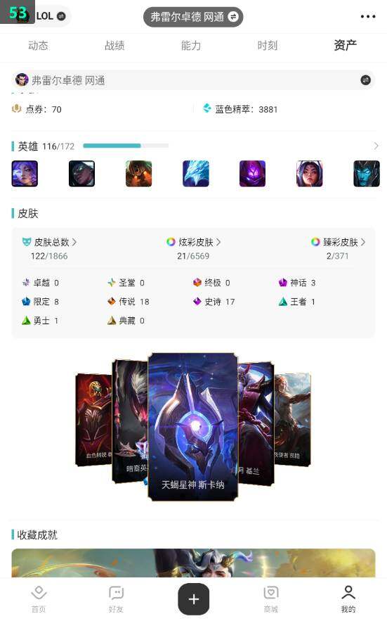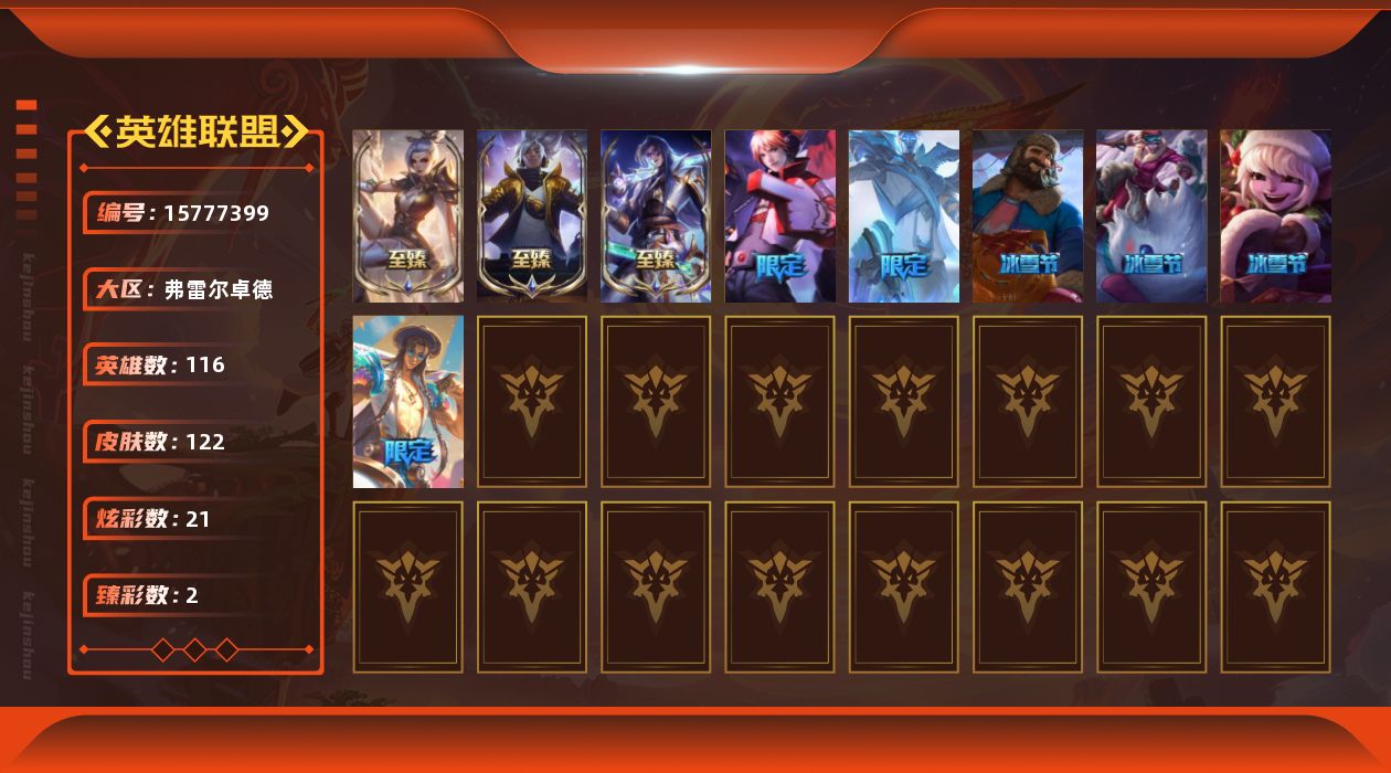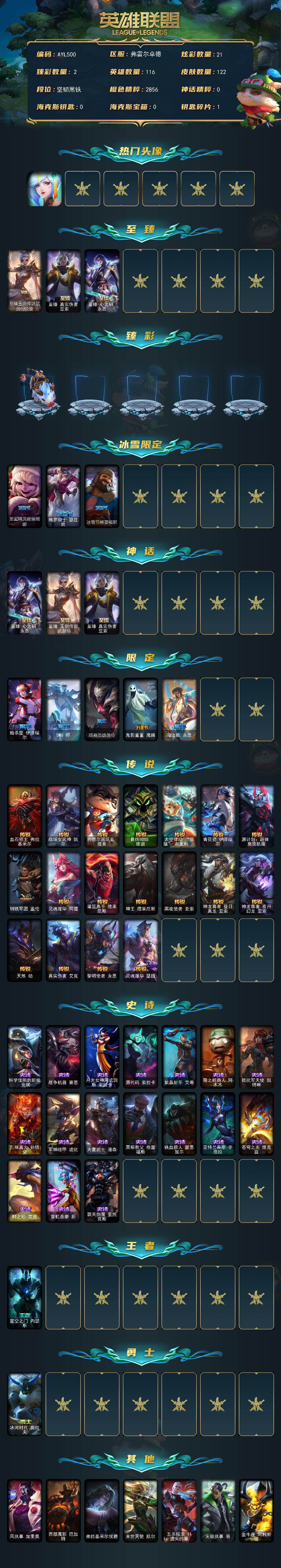 未定级段位-116英雄-122皮肤-21炫彩-0终极-3神话-8限定-18传说-17史诗