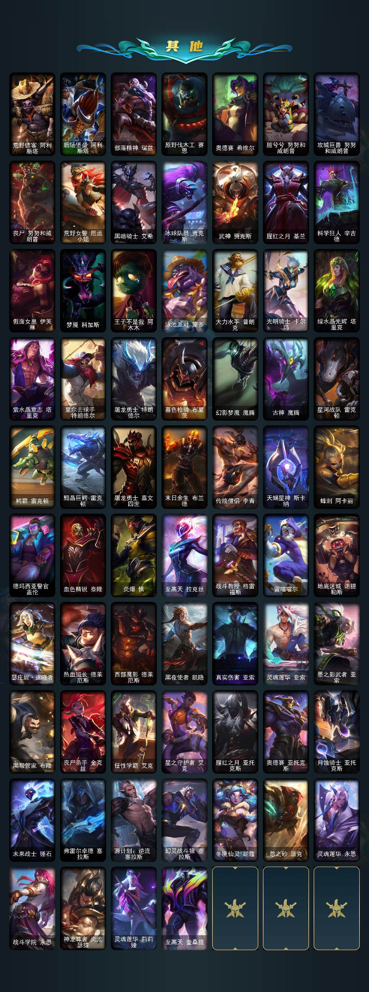 【其他皮肤1】:风执事加里奥,西部魔影厄加特,弗拉基米尔侯爵,末世天使凯尔,五杀摇滚III遗失的章节凯尔,无极执事易,金牛座阿利斯塔,荒野镖客阿利斯塔,后场堡垒阿利斯塔,部落精神瑞兹,原野伐木工赛恩,奥德赛希维尔,脏兮兮努努和威朗普,攻城巨兽努努和威朗普,丧尸努努和威朗普,荒野女警厄运小姐,黑暗骑士艾希,冰球队员贾克斯,武神贾克斯,腥红之月基兰,科学狂人辛吉德,假面女皇伊芙琳,梦魇科加斯,王子不是我阿木木,泳池派对蒙多,大力水手普朗克,光明骑士卡尔玛,绿水晶光辉塔里克,紫水晶意志塔里克,里尔击球手特朗德尔,屠龙勇士特朗德尔,暮色枪骑布里茨,幻影梦魔魔腾,古神魔腾,星河战队雷克顿,鳄霸雷克顿,黯晶巨鳄雷克顿,屠龙勇士嘉文四世,末日余生布兰德,传统僧侣李青,天蝎星神斯卡纳,蜂刺阿卡丽,德玛西亚警官盖伦,血色精锐泰隆,炎爆慎,至高天拉克丝,战斗教授格雷福斯,雷喵喵尔,地底迷城诺提勒斯,瑟庄妮逐晓者,热血班长德莱厄斯,西部魔影德莱厄斯,黑夜使者凯隐,真实伤害亚索,