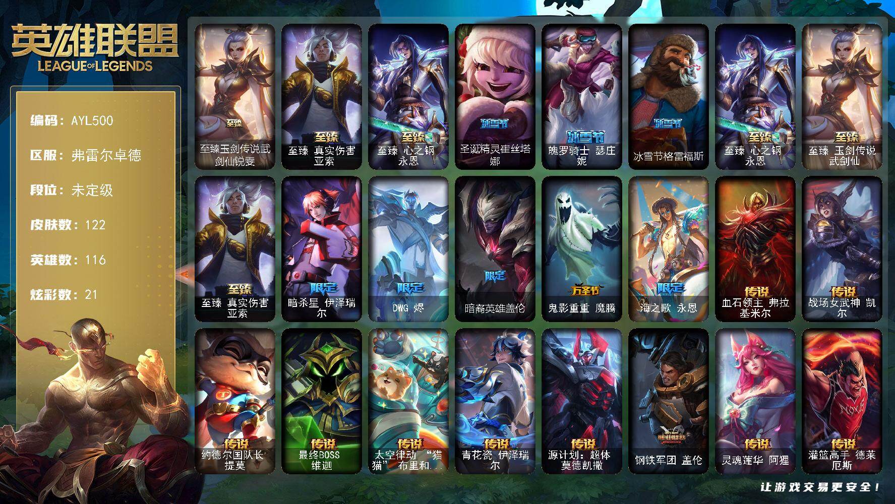 [15777399]【特价出售/店主推荐】 未定级段位-116英雄-122皮肤-21炫彩-0终极-3神话-8限定-18传说-17史诗 【热门头像】:春晖神女头像 【至臻皮肤】:至臻玉剑传说武剑仙锐雯,至臻真实伤害亚索,至臻心之钢永恩 【臻彩皮肤】:无畏骑士瑟庄妮赤子初心 【冰雪限定】:圣诞精灵崔丝塔娜,魄罗骑士瑟庄妮,冰雪节格雷福斯 【神话皮肤】:至臻真实伤害亚索,至臻心之钢永恩,至臻玉剑传说武剑仙 【限定皮肤】:暗杀星伊泽瑞尔,DWG烬,暗裔英雄盖伦,鬼影重重魔腾,海之歌永恩 【传说皮肤】:血石领主弗拉基米尔,战场女武神凯尔,约德尔国队长提莫,最终BOSS维迦,太空律动猫猫布里和里茨,青花瓷伊泽瑞尔,源计划超体莫德凯撒,钢铁军团盖伦,灵魂莲华阿狸,灌篮高手德莱厄斯,神王德莱厄斯,黑夜使者亚索,神龙尊者昼日真龙亚索,神龙尊者夜月幻龙亚索,天煞劫,真实伤害艾克,黎明使者永恩,灵魂莲华瑟提 【史诗皮肤】:科学怪熊的新娘安妮,战争机器赛恩,月光女神阿忒弥斯索拉卡,源代码索拉卡,紫晶射手艾希,殇之机器人阿木木,抵抗军天使凯特琳,三昧真火孙悟空,军神战甲波比,大夏武士潘森,黑帮教父格雷福斯,铁血猎人雷恩加尔,亚特兰蒂斯辛德拉,苍穹之光维克兹,时之砂艾克,霓虹杀拳蔚,霸天剑魔亚托克斯 【王者皮肤】:星空之门内瑟斯 【勇士皮肤】:冰河时代奥拉夫 【其他皮肤1】:风执事加里奥,西部魔影厄加特,弗拉基米尔侯爵,末世天使凯尔,五杀摇滚III遗失的章节凯尔,无极执事易,金牛座阿利斯塔,荒野镖客阿利斯塔,后场堡垒阿利斯塔,部落精神瑞兹,原野伐木工赛恩,奥德赛希维尔,脏兮兮努努和威朗普,攻城巨兽努努和威朗普,丧尸努努和威朗普,荒野女警厄运小姐,黑暗骑士艾希,冰球队员贾克斯,武神贾克斯,腥红之月基兰,科学狂人辛吉德,假面女皇伊芙琳,梦魇科加斯,王子不是我阿木木,泳池派对蒙多,大力水手普朗克,光明骑士卡尔玛,绿水晶光辉塔里克,紫水晶意志塔里克,里尔击球手特朗德尔,屠龙勇士特朗德尔,暮色枪骑布里茨,幻影梦魔魔腾,古神魔腾,星河战队雷克顿,鳄霸雷克顿,黯晶巨鳄雷克顿,屠龙勇士嘉文四世,末日余生布兰德,传统僧侣李青,天蝎星神斯卡纳,蜂刺阿卡丽,德玛西亚警官盖伦,血色精锐泰隆,炎爆慎,至高天拉克丝,战斗教授格雷福斯,雷喵喵尔,地底迷城诺提勒斯,瑟庄妮逐晓者,热血班长德莱厄斯,西部魔影德莱厄斯,黑夜使者凯隐,真实伤害亚索,