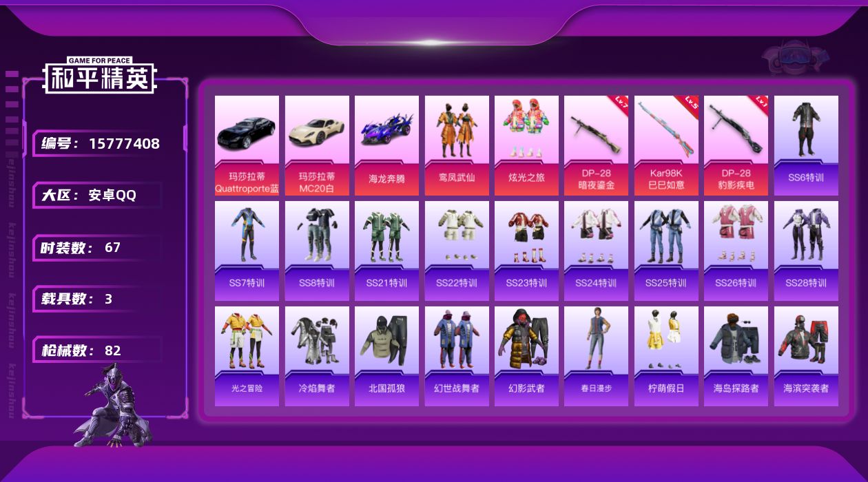 [15777408]安卓 手Q-2粉装-3特效枪-3载具-1粉色飞行器-29630热力值-2王牌印记-67套装-82枪皮 【热门品类】:小恶魔头饰 【粉色载具】:玛莎拉蒂MC20(星石白),玛莎拉蒂Quattroporte(夜幕蓝),海龙奔腾 【粉色套装】:粉装-鸾凤武仙,粉装-炫光之旅 【粉色枪皮等级】:Kar98K-巳巳如意(五级),DP-28-暗夜鎏金(七级),DP-28-豹影疾电(一级) 【粉色枪皮】:Kar98K-巳巳如意,DP-28-暗夜鎏金,DP-28-豹影疾电 【粉色飞行器】:翩跹演武飞行器 【粉色降落伞】:暗夜鎏金降落伞,炫光之旅降落伞,千金淑猫降落伞 【稀有枪皮】:AKM-2P战斗服款,AKM-彩虹符号,AKM-生命誓言,AKM-龙的传人,SCAR-L-炫彩节奏,SCAR-L-玉兔迎春,M416-糯团青竹,M416-蓝色火焰,GROZA-田园牧歌,AUG-幻影战神,AUG-闲梦青缨,QBZ-彩虹符号,M762-天降萌叽,M762-奇异狩猎者,M762-暗夜鎏金,G36C-暗夜玫瑰,AC-VAL-天降萌叽,蜜獾-天降萌叽,蜜獾-娇憨猪猪,UZI-墨染幽兰,UZI-娇憨猪猪,UZI-炫彩节奏,UMP45-蓝色火焰,Vector-田园牧歌,汤姆逊-天降萌叽,汤姆逊-暗夜鎏金,Kar98K-彩虹符号,Kar98K-红色方程式,SKS-夜灯,SKS-炫彩节奏,VSS-田园牧歌,Mini14-穿刺龙虾,SLR-娇憨猪猪,AMR-翩跹演武,S686-生命誓言,S686-雪月幻音,S1897-春暖花开,S1897-暗夜鎏金,S12K-玩趣呆呆,S12K-娇憨猪猪,S12K-幻世战舞者,DBS-彩虹甜喵,DBS-彩虹符号,SPAS-12-田园牧歌,M249-彩虹符号,M249-糯团青竹,DP-28-彩虹符号,DP-28-齐天大圣,MG3-幻世战舞者,MG3-第五大道,沙漠之鹰-旋转彩虹,大砍刀-2P战斗服款 【其他套装】:套装-SS6特训,套装-SS7特训,套装-SS8特训,套装-SS21特训,套装-SS22特训,套装-SS23特训,套装-SS24特训,套装-SS25特训,套装-SS26特训,套装-SS28特训,套装-光之冒险,套装-冷焰舞者,套装-北国孤狼,套装-幻世战舞者,套装-幻影武者,套装-春日漫步,套装-柠萌假日,套装-海岛探路者,套装-海滨突袭者,套装-猎鹰,套装-疯狂