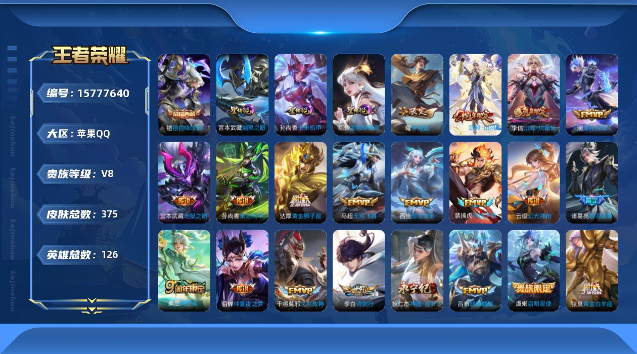 - [12388639]【商品标题】:苹果Q-V9-至尊星耀II段位-125英雄-386皮肤-4典藏-0珍品无双-0无双-0珍品传说-36传说-118史诗 【荣耀典藏】:孙尚香杀手不太冷,李白鸣剑曳影,诸葛亮星域神启,虞姬神鉴启示录 【内测皮肤】:孙尚香蔷薇恋人,艾琳女武神,高渐离玩趣恶龙,狂铁特工战影 【传说皮肤】:孙尚香末日机甲,貂蝉仲夏夜之梦,百里玄策白虎志,干将莫邪久胜战神,貂蝉猫影幻舞,李信一念神魔,曜云鹰飞将,虞姬启明星使,镜炽阳神光,诸葛亮时雨天司,公孙离祈雪灵祝,周瑜音你心动,曜李逍遥 ,西施游龙清影,貂蝉遇见胡旋,孙尚香异界灵契,马可波罗深海之息,王昭君星穹之声,不知火舞绯月行,狄仁杰神器狴犴令,李白诗剑行,李信山海炽霜斩,曜山海苍雷引,小乔山海琳琅生,伽罗炽翼辉光,公孙离记忆之芯,云缨鹤归松栖,鲁班七号时之奇旅,大乔时之奇旅,露娜霜月吟,澜逐花归海,赵云乘龙铭钟鼎,孙策乘龙淬吴钩,孙尚香乘龙问璇玑,貂蝉曦玄引,桑启鸣野蒿 【限定皮肤】:蒙犽顽岩魄,大乔绒语心约,姜子牙天穹之誓,杨戬破阵退雄兵,狄仁杰阴阳师,小乔山海琳琅生,赵云皇家上将,墨子神迹守卫,孙尚香蔷薇恋人,孙尚香异界灵契,鲁班七号时之奇旅,庄周高山流水,高渐离玩趣恶龙,阿轲迷踪丽影,钟无艳超时空战士,孙膑天狼运算者,扁鹊奇幻香踪,芈月白晶晶,元歌云间偶戏,元歌无心,夏侯惇朔风刀,甄姬落雪兰心,马可波罗暗影游猎,马可波罗深海之息,马可波罗山海玄木吟,狄仁杰魔术师,狄仁杰万华元夜,狄仁杰神器狴犴令,达摩星际陆战队,达摩沙漠行僧,项羽海滩派对,老夫子醍醐杖,老夫子航海奇遇记,貂蝉遇见胡旋,安琪拉魔法小厨娘,程咬金演武夺筹,刘邦夺宝奇兵,韩信傲雪梅枪,王昭君凤凰于飞,王昭君星穹之声,兰陵王金庭之子,花木兰默契交锋,不知火舞绯月行,亚瑟潮玩骑士王,后羿圣弓游侠,李元芳匿光侦查者,李元芳云中旅人,虞姬霸王别姬,虞姬启明星使,钟馗驱傩正仪,杨玉环遇见飞天,杨玉环寅虎心曲,杨戬潮玩骑兵,女娲朔望之晖,干将莫邪真爱魔法,雅典娜单词大作战,雅典娜黎明之约,蔡文姬繁星吟游,太乙真人华丽摇滚,鬼谷子原初探秘者,鬼谷子五谷丰年,诸葛亮时雨天司,大乔时之奇旅,苏烈千军破阵,百里玄策白虎志,百里玄策原初追逐者,弈星混沌棋,梦奇顽趣,公孙离祈雪灵祝,沈梦溪大漠名商,明世隐疑决卦,明世隐吟游魔法,裴擒虎天狼狩猎者,裴擒虎李小龙,裴擒虎擒涛扼浪