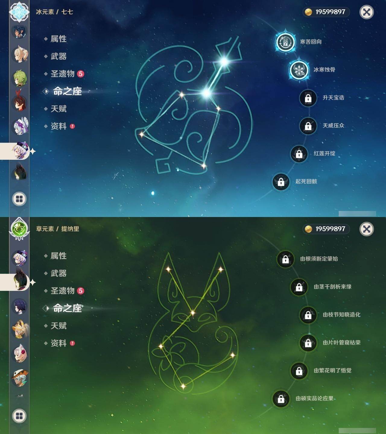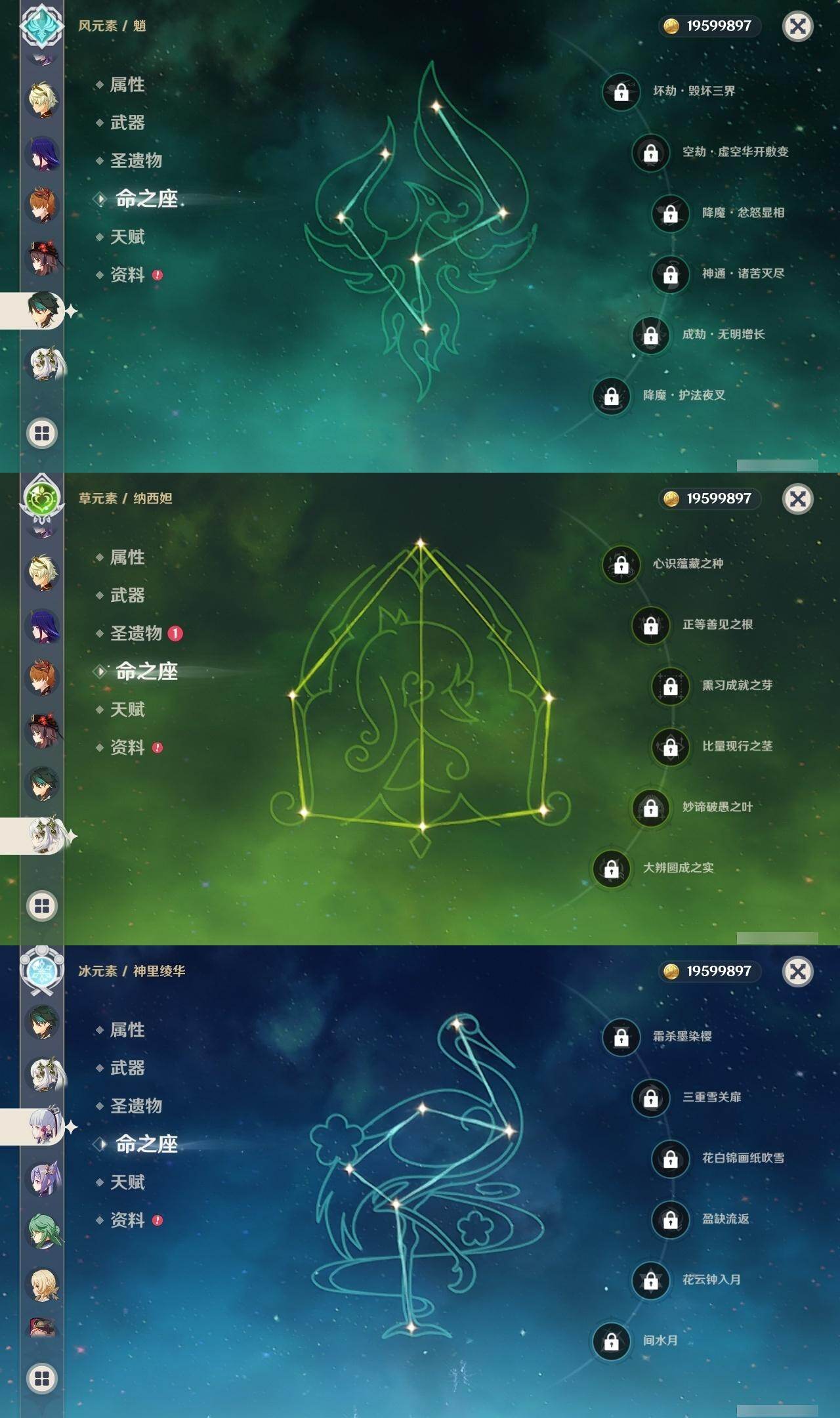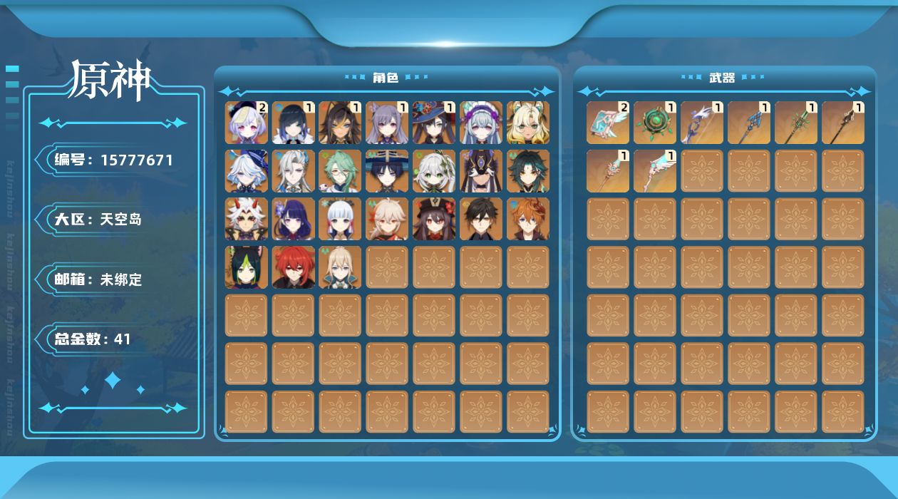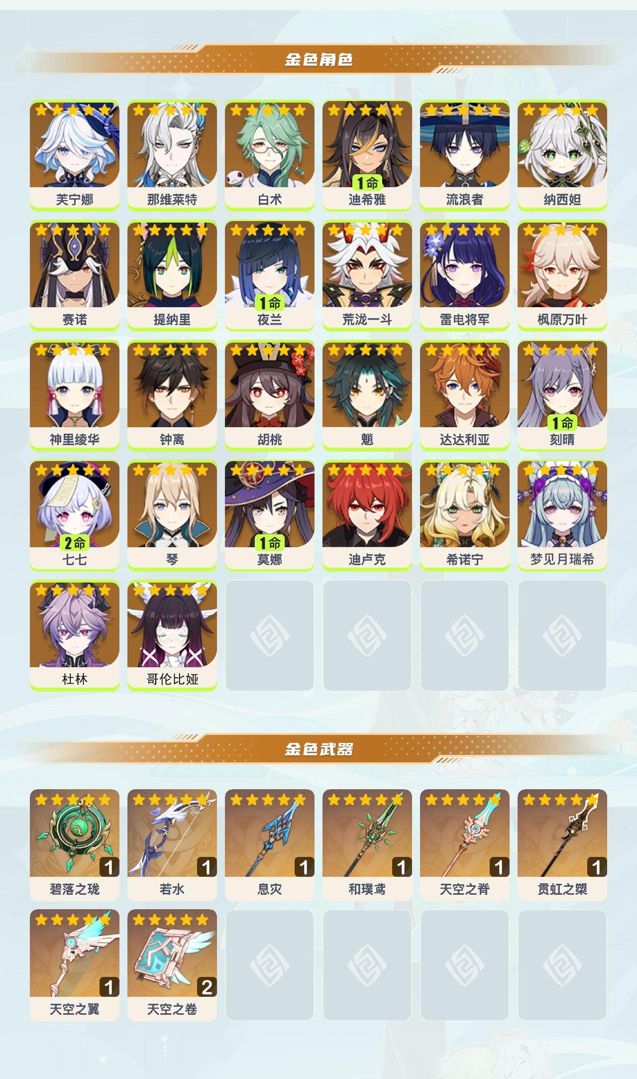 0命芙宁娜,0命那维莱特,0命白术,1命迪希雅,0命流浪者,0命纳西妲,0命赛诺,0命提纳里,1命夜兰,0命荒泷一斗,0命雷电将军,0命枫原万叶,0命神里绫华,0命钟离,0命胡桃,0命魈,0命达达利亚,1命刻晴,2命七七,0命琴,1命莫娜,0命迪卢克,0命希诺宁,0命梦见月瑞希,0命杜林,0命哥伦比娅,精1碧落之珑,精1若水,精1息灾,精1和璞鸢,精1天空之脊,精1贯虹之槊,精1天空之翼,精2天空之卷