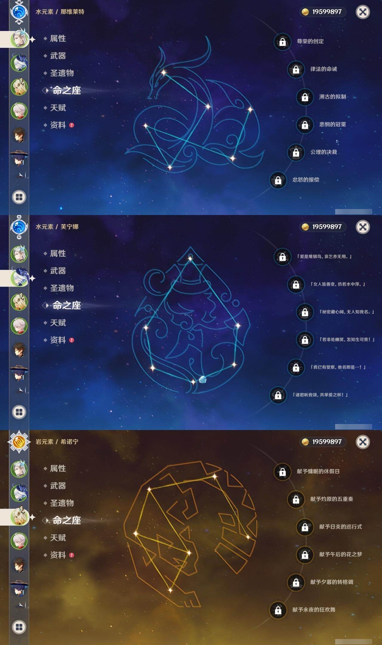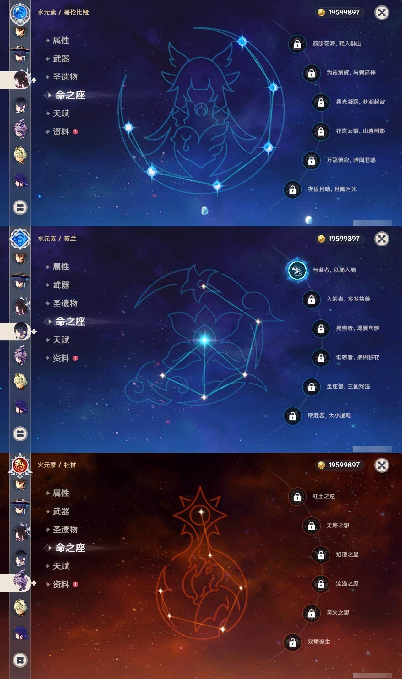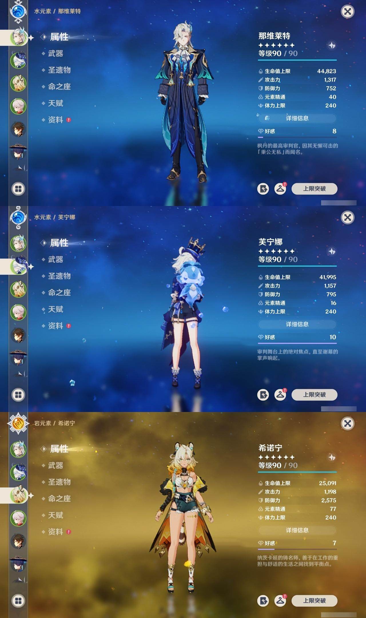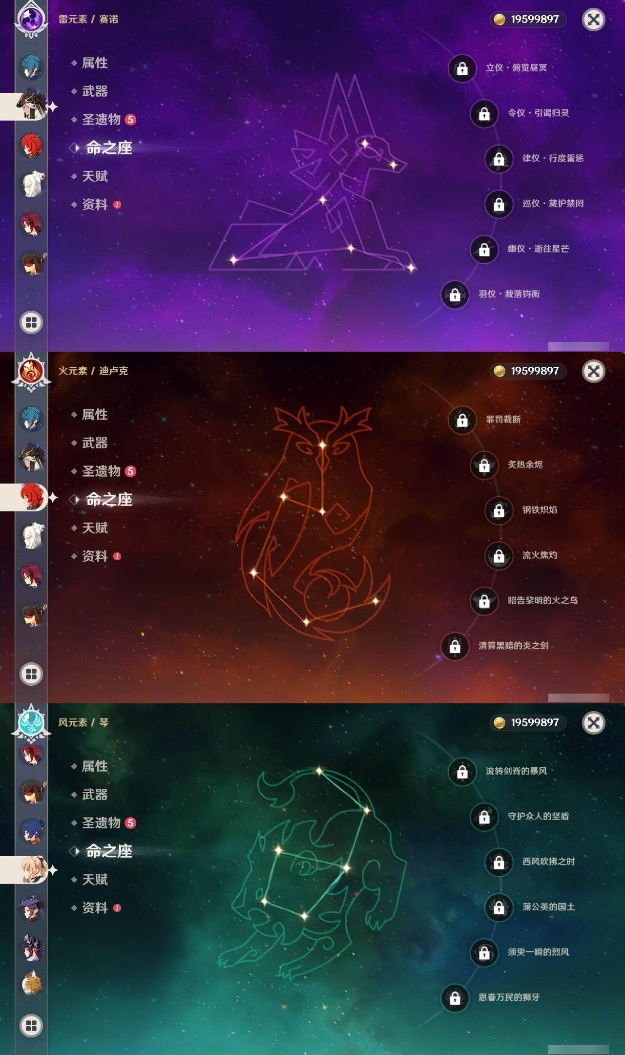 0命芙宁娜,0命那维莱特,0命白术,1命迪希雅,0命流浪者,0命纳西妲,0命赛诺,0命提纳里,1命夜兰,0命荒泷一斗,0命雷电将军,0命枫原万叶,0命神里绫华,0命钟离,0命胡桃,0命魈,0命达达利亚,1命刻晴,2命七七,0命琴,1命莫娜,0命迪卢克,0命希诺宁,0命梦见月瑞希,0命杜林,0命哥伦比娅,精1碧落之珑,精1若水,精1息灾,精1和璞鸢,精1天空之脊,精1贯虹之槊,精1天空之翼,精2天空之卷
