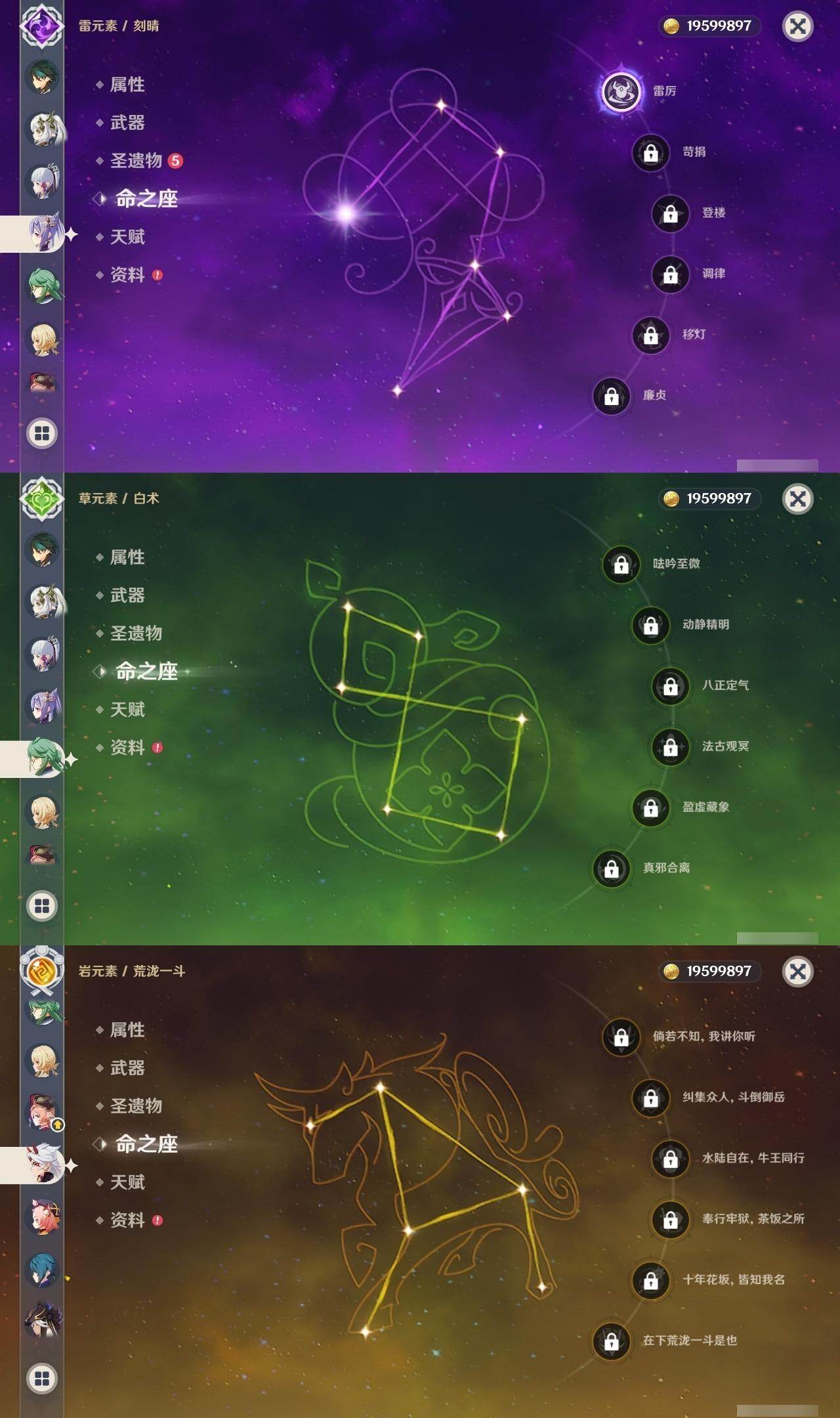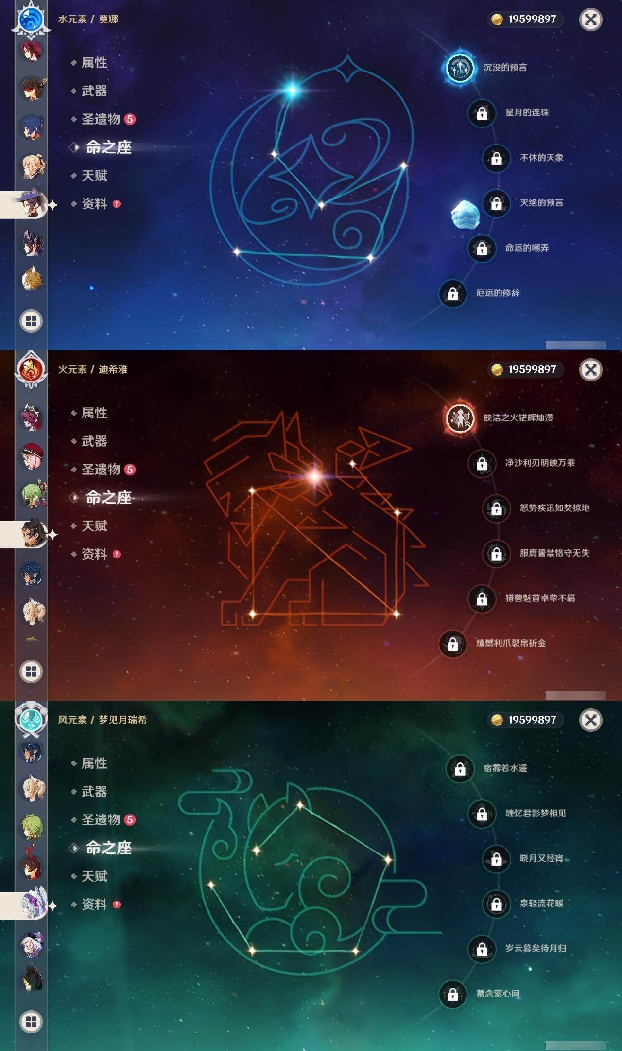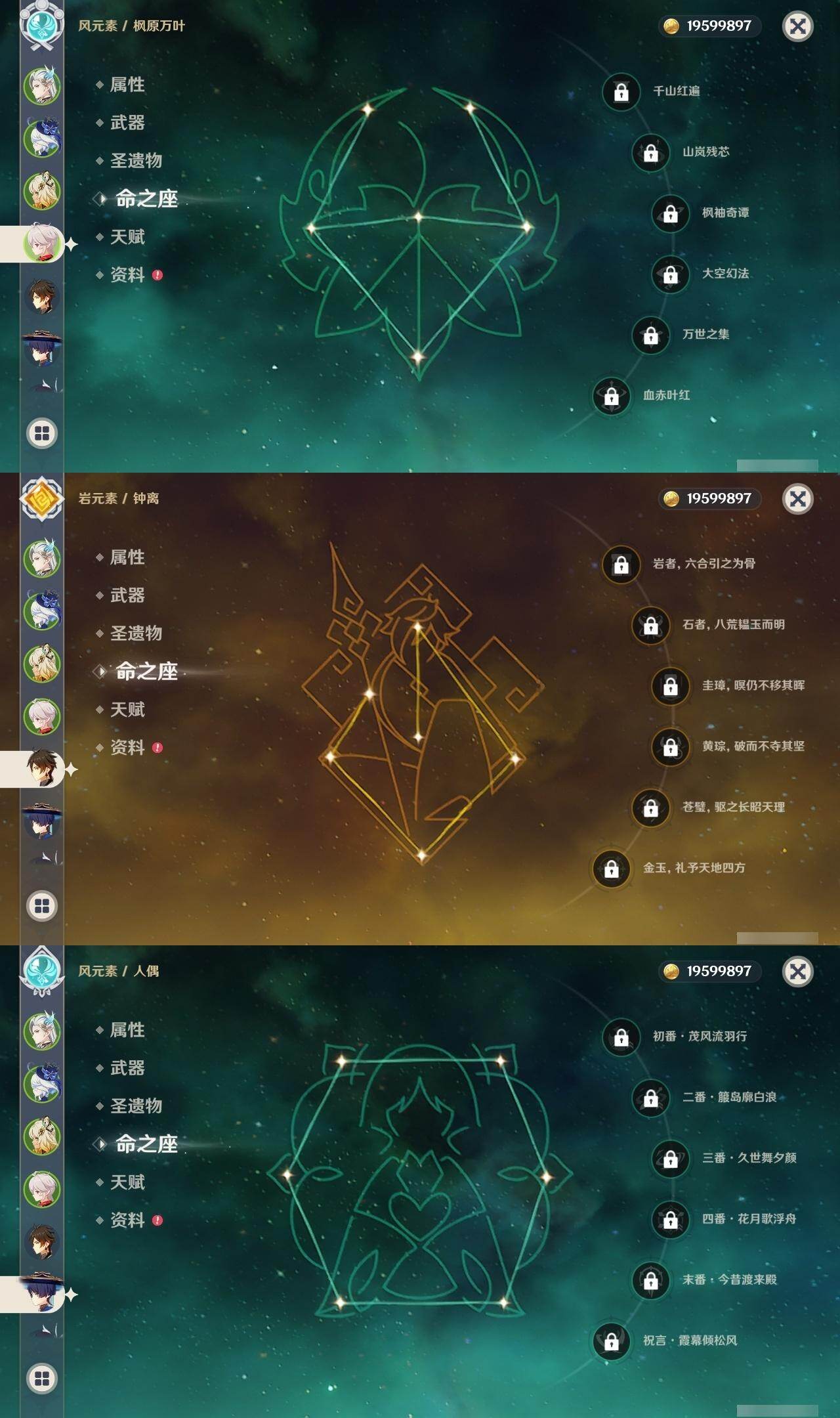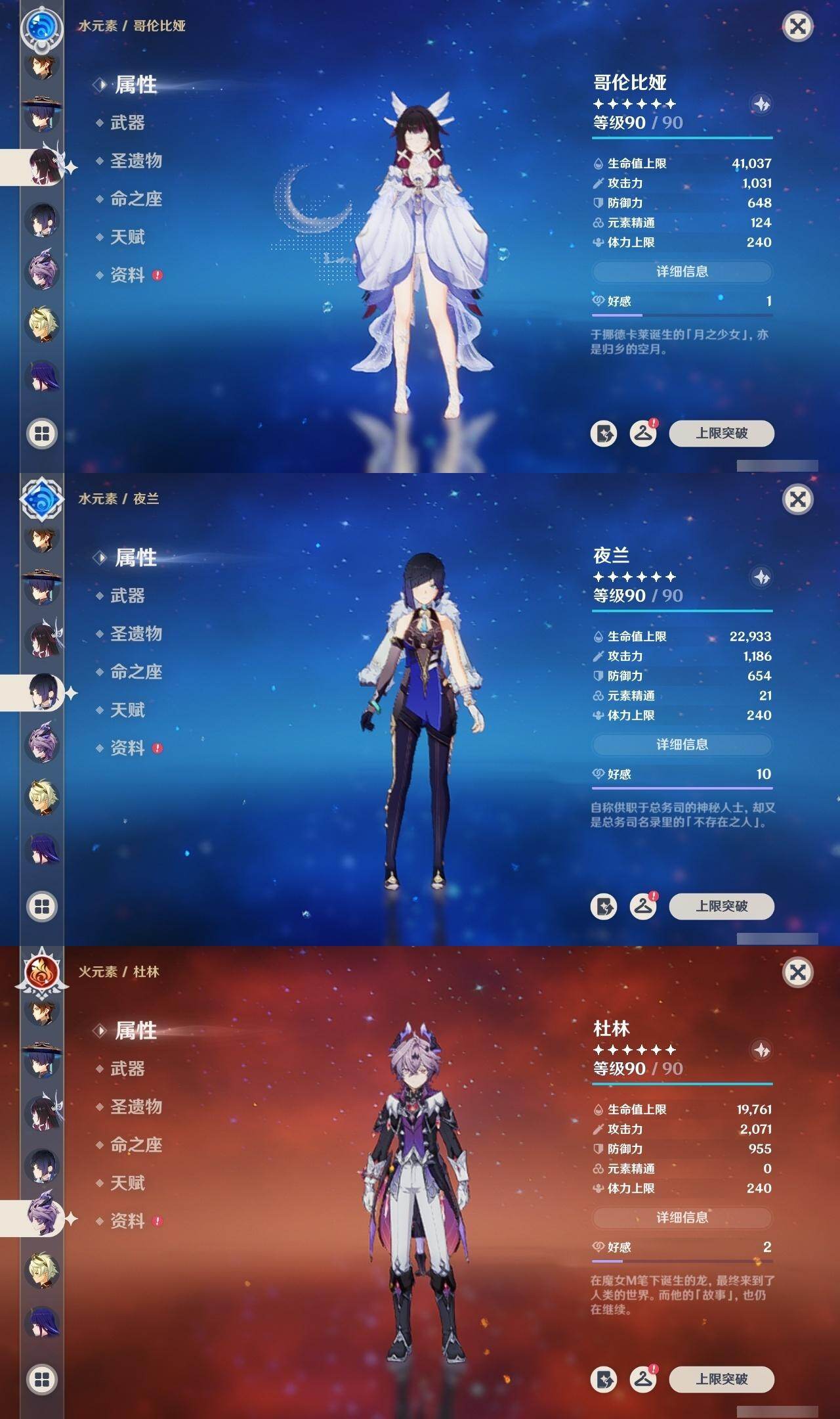 0命芙宁娜,0命那维莱特,0命白术,1命迪希雅,0命流浪者,0命纳西妲,0命赛诺,0命提纳里,1命夜兰,0命荒泷一斗,0命雷电将军,0命枫原万叶,0命神里绫华,0命钟离,0命胡桃,0命魈,0命达达利亚,1命刻晴,2命七七,0命琴,1命莫娜,0命迪卢克,0命希诺宁,0命梦见月瑞希,0命杜林,0命哥伦比娅,精1碧落之珑,精1若水,精1息灾,精1和璞鸢,精1天空之脊,精1贯虹之槊,精1天空之翼,精2天空之卷