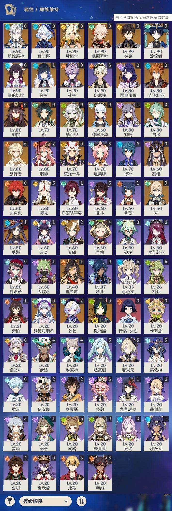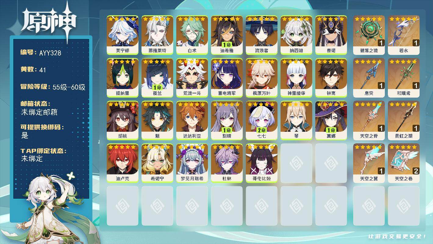 [15777671]【店主推荐捡漏号】59级/41黄/女主/26个五星角色/8个五星武器 0命芙宁娜,0命那维莱特,0命白术,1命迪希雅,0命流浪者,0命纳西妲,0命赛诺,0命提纳里,1命夜兰,0命荒泷一斗,0命雷电将军,0命枫原万叶,0命神里绫华,0命钟离,0命胡桃,0命魈,0命达达利亚,1命刻晴,2命七七,0命琴,1命莫娜,0命迪卢克,0命希诺宁,0命梦见月瑞希,0命杜林,0命哥伦比娅,精1碧落之珑,精1若水,精1息灾,精1和璞鸢,精1天空之脊,精1贯虹之槊,精1天空之翼,精2天空之卷