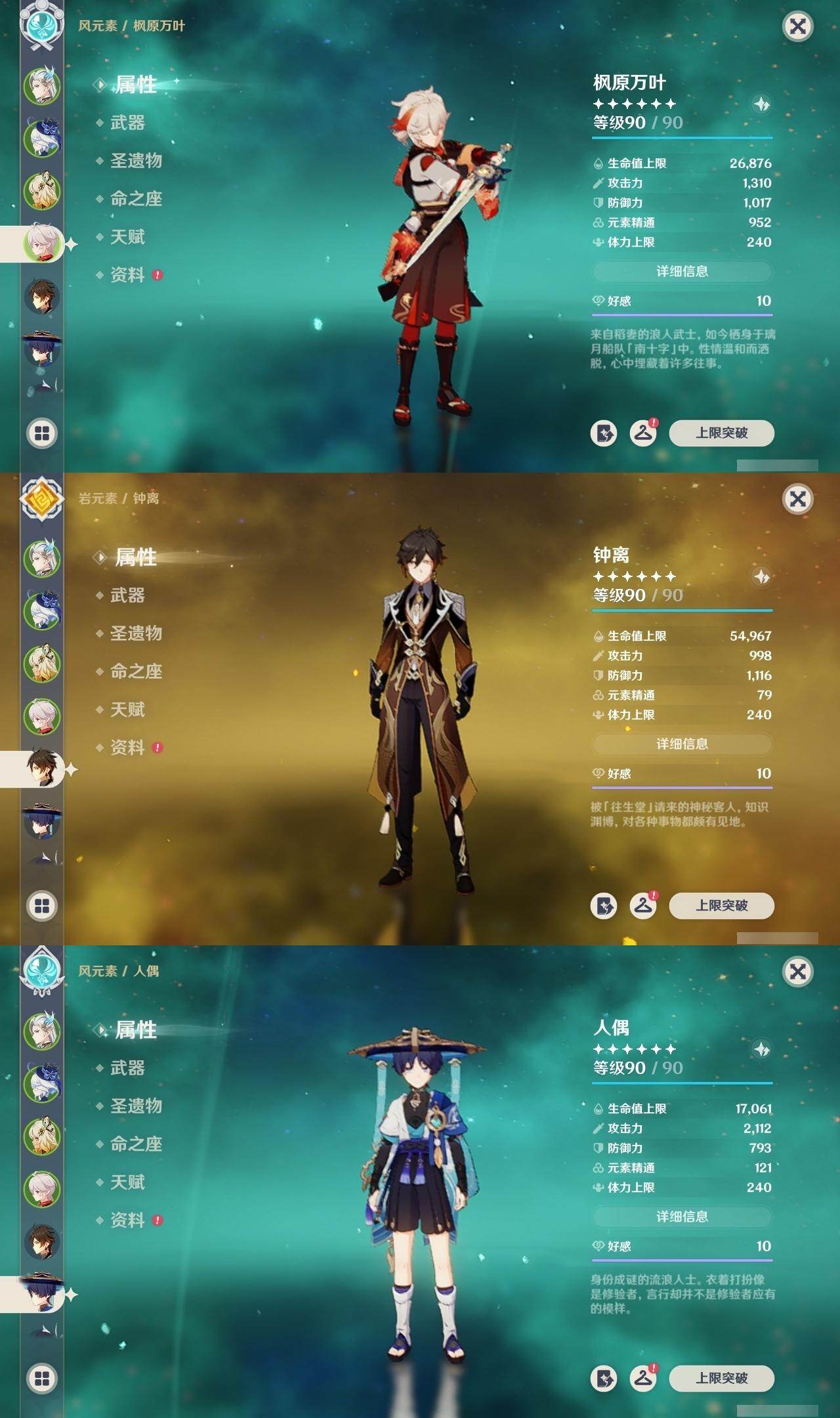 枫原万叶,钟离,雷电将军,达达利亚,胡桃,魈,神里凌华,刻晴,荒泷一斗,迪卢克,琴,莫娜,七七