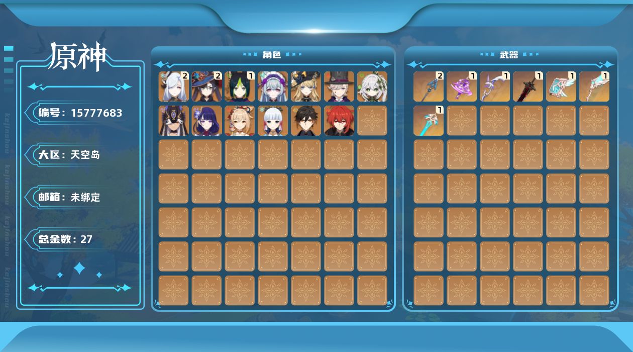 0命娜维娅,0命林尼,0命纳西妲,0命赛诺,1命提纳里,2命申鹤,0命雷电将军,0命神里绫华,0命钟离,0命宵宫,2命莫娜,0命迪卢克,0命梦见月瑞希,0命奈芙尔,精1神乐之真意,精2息灾,精1天空之翼,精1阿莫斯之弓,精1天空之刃,精1天空之卷,精1狼的末路