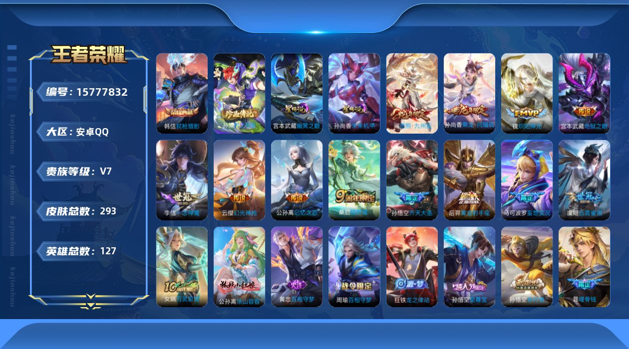 [15777832]按键10 安卓Q-293皮肤-1典藏皮肤-1珍品传说-13传说-83史诗 【英雄全皮】:影全皮 【荣耀典藏】:韩信弑枪猎影 【珍品传说】:孙策时之奇旅 【传说皮肤】:后羿神树通天,澜愿照九州拓,云缨幻光神枪,桑启鸣野蒿,孙尚香乘龙问璇玑,马可波罗妄想实况,公孙离记忆之芯,孙悟空齐天大圣,镜炽阳神光,李信一念神魔,虞姬云霓雀翎,后羿黄金射手座,宫本武藏地狱之眼 【限定皮肤】:暃埋骨钱,蔡文姬夏日便利店,虞姬夏日便利店,姜子牙天穹之誓,李白谪仙醉月,狄仁杰阴阳师,赵云皇家上将,高渐离玩趣恶龙,钟无艳超时空战士,吕布猎兽之王,元歌云间偶戏,元歌无心,甄姬落雪兰心,马可波罗山海玄木吟,马可波罗妄想实况,狄仁杰魔术师,达摩沙漠行僧,项羽海滩派对,程咬金演武夺筹,韩信飞衡,韩信傲雪梅枪,兰陵王金庭之子,孙悟空至尊宝,孙悟空大圣娶亲,孙悟空孙行者,孙悟空齐天大圣,李元芳云中旅人,钟馗驱傩正仪,女娲朔望之晖,干将莫邪胡桃夹子,鬼谷子五谷丰年,苏烈千军破阵,百里玄策原初追逐者,梦奇顽趣,沈梦溪大漠名商,裴擒虎李小龙,裴擒虎擒涛扼浪,云中君纤云弄巧,猪八戒西部大镖客,上官婉儿梁祝,嫦娥拒霜思,嫦娥暖冬兔眠,鲁班大师探海日志,桑启海盐诗旅,暃星界游侠,艾琳流音漫舞,司空震地狱燃心,阿古朵江河有灵,张良古海寻踪,蒙犽百解令,蒙恬荣光圣徽,高渐离燃音魔法,妲己灵卜魔法,鬼谷子天穹祈灯,伽罗琥珀纪元,姬小满妄想食味,安琪拉乘龙聚宝船,孙尚香乘龙问璇玑,沈梦溪龙舞盛年,鲁班七号蔬乡物语,李元芳蔬乡物语,刘邦剑破天穹,程咬金群星魔术团,周瑜熔金海岸 【年限皮肤】:韩信飞衡,马可波罗山海玄木吟,安琪拉乘龙聚宝船,孙尚香乘龙问璇玑 【赛季限定】:达摩沙漠行僧,程咬金演武夺筹,兰陵王金庭之子,张良古海寻踪,李元芳云中旅人,钟馗驱傩正仪,苏烈千军破阵,百里玄策原初追逐者,梦奇顽趣,沈梦溪大漠名商,裴擒虎擒涛扼浪,鲁班大师探海日志,桑启海盐诗旅,鬼谷子天穹祈灯,蒙恬荣光圣徽,刘邦剑破天穹,姜子牙天穹之誓 【战令限定】:蔡文姬夏日便利店,虞姬夏日便利店,钟无艳超时空战士,吕布猎兽之王,元歌云间偶戏,甄姬落雪兰心,艾琳流音漫舞,女娲朔望之晖,猪八戒西部大镖客,嫦娥暖冬兔眠,司空震地狱燃心,暃星界游侠,高渐离燃音魔法,妲己灵卜魔法,鲁班七号蔬乡物语,李元芳蔬乡物语 【史诗皮肤】:项羽苍穹之光,露娜紫霞仙子,赵云