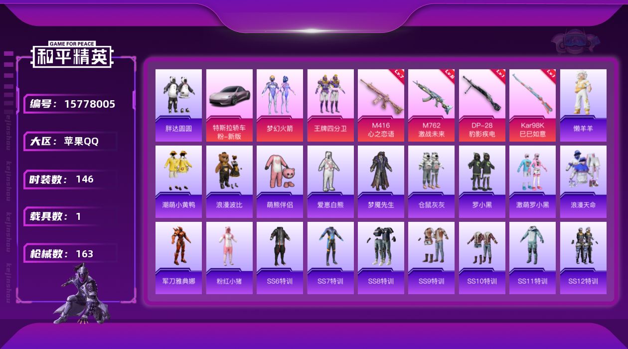 [15778005]可二次【店主推荐捡漏号!可直接换绑】苹果 手Q-无敌战神框-2粉装-4特效枪-1载具-1粉色飞行器-55939热力值-19王牌印记-146套装-163枪皮