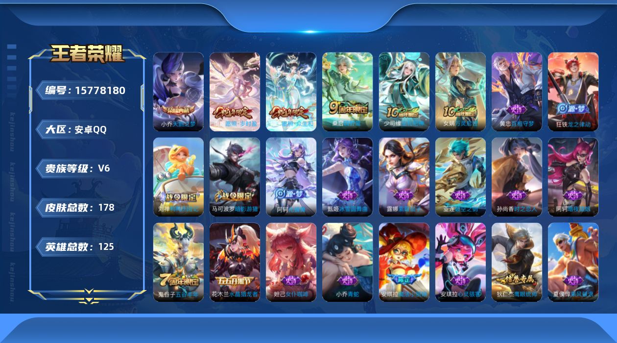 [15778180]按键5安卓Q-178皮肤-1典藏皮肤-4传说-47史诗 【荣耀典藏】:小乔天鹅之梦 【传说皮肤】:后羿神树通天,妲己愿照众生和,虞姬愿照岁时盈,桑启鸣野蒿 【限定皮肤】:蒙犽顽岩魄,蔡文姬夏日便利店,大乔绒语心约,虞姬夏日便利店,姜子牙天穹之誓,狄仁杰阴阳师,赵云皇家上将,孙尚香蔷薇恋人,马可波罗暗影游猎,狄仁杰魔术师,项羽海滩派对,安琪拉魔法小厨娘,李元芳云中旅人,鬼谷子五谷丰年,裴擒虎擒涛扼浪,上官婉儿梁祝,鲁班大师探海日志,桑启海盐诗旅,阿古朵江河有灵,张良古海寻踪,鬼谷子天穹祈灯,沈梦溪龙舞盛年,刘邦剑破天穹,上官婉儿群星魔术团,程咬金群星魔术团,镜青焰无极,项羽苍威无极,刘备异域游侠,芈月浮光幕影,周瑜熔金海岸 【赛季限定】:张良古海寻踪,李元芳云中旅人,裴擒虎擒涛扼浪,鲁班大师探海日志,桑启海盐诗旅,鬼谷子天穹祈灯,刘邦剑破天穹,姜子牙天穹之誓 【战令限定】:蔡文姬夏日便利店,虞姬夏日便利店,马可波罗暗影游猎,镜青焰无极,项羽苍威无极 【史诗皮肤】:露娜紫霞仙子,阿轲暗夜猫娘,赵云皇家上将,貂蝉圣诞恋歌,甄姬冰雪圆舞曲,王昭君偶像歌手,狄仁杰魔术师,廉颇地狱岩魂,宫本武藏鬼剑武藏,孙尚香蔷薇恋人,孙尚香水果甜心,妲己女仆咖啡,刘禅绅士熊喵,安琪拉魔法小厨娘,花木兰水晶猎龙者,夏侯惇乘风破浪,小乔缤纷独角兽,安琪拉心灵骇客,蔡文姬舞动绿茵,李元芳逐浪之夏,白起星夜王子,大乔猫狗日记,伽罗箭羽风息,狄仁杰鹰眼统帅,上官婉儿梁祝,大乔白蛇,小乔青蛇,孙尚香时之恋人,马可波罗暗影游猎,西施诗语江南,鬼谷子五谷丰年,阿古朵江河有灵,上官婉儿群星魔术团,镜青焰无极,芈月浮光幕影,蔡文姬夏日便利店,蒙犽顽岩魄,亚连破空之剑,牛魔星界战将,孙膑茶境仙,弈星万物之道,阿轲化蝶舞,刘禅鸭鸭历险记,狂铁龙之律动,黄忠百相守梦,女娲万灵启世,少司缘巫礼祀神 【其他皮肤】:项羽海滩派对,露娜哥特玫瑰,达摩大发明家,赵云白执事,赵云忍炎影,芈月红桃皇后,白起白色死神,牛魔西部大镖客,安琪拉玩偶对对碰,孙膑天使之翼,典韦黄金武士,亚瑟死亡骑士,达摩拳王,花木兰兔女郎,张飞五福同心,甄姬花好人间,后羿阿尔法小队,狄仁杰阴阳师,刘备汉昭烈帝,李元芳黑猫爱糖果,关羽龙腾万里,钟无艳海滩丽影,王昭君幻想奇妙夜,牛魔制霸全明星,孙尚香沉稳之力,诸葛亮掌控之力,鬼谷子幻乐之宴,大乔守护之力,明