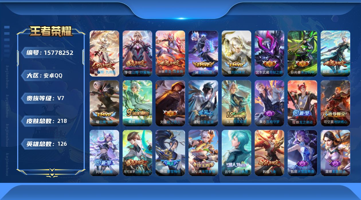 - [15784955]安卓Q-207皮肤-1典藏皮肤-12传说-50史诗 【荣耀典藏】:韩信弑枪猎影 【传说皮肤】:裴擒虎寅虎赤拳,赵云淬星耀世,镜炽阳神光,虞姬启明星使,曜云鹰飞将,李信一念神魔,百里玄策白虎志,后羿黄金射手座,孙尚香末日机甲,宫本武藏地狱之眼,孙悟空地狱火,狄仁杰超时空战士 【限定皮肤】:狄仁杰阴阳师,赵云皇家上将,墨子神迹守卫,妲己时之彼端,嬴政白昼王子,孙尚香蔷薇恋人,鲁班七号狮舞东方,阿轲迷踪丽影,吕布猎兽之王,夏侯惇朔风刀,曹操烛龙,典韦穷奇,典韦蓝屏警告,马可波罗暗影游猎,狄仁杰魔术师,狄仁杰万华元夜,达摩沙漠行僧,项羽海滩派对,老夫子醍醐杖,老夫子航海奇遇记,程咬金演武夺筹,刘邦夺宝奇兵,兰陵王金庭之子,孙悟空至尊宝,孙悟空大圣娶亲,后羿辉光之辰,李元芳云中旅人,虞姬启明星使,钟馗神迹守卫,钟馗驱傩正仪,杨玉环遇见飞天,女娲朔望之晖,蔡文姬繁星吟游,东皇太一逐梦之光,鬼谷子原初探秘者,黄忠烈魂,百里玄策白虎志,弈星混沌棋,沈梦溪大漠名商,明世隐疑决卦,裴擒虎李小龙,裴擒虎寅虎赤拳,裴擒虎擒涛扼浪,狂铁御狮,米莱狄御霄,云中君时之祈愿,盾山御銮,猪八戒西部大镖客,上官婉儿梁祝,上官婉儿天狼绘梦者,鲁班大师探海日志,桑启海盐诗旅,张良古海寻踪,鬼谷子天穹祈灯,百里玄策超元猎域 【年限皮肤】:百里玄策白虎志,裴擒虎寅虎赤拳,后羿辉光之辰,黄忠烈魂 【赛季限定】:夏侯惇朔风刀,曹操烛龙,典韦穷奇,狄仁杰万华元夜,达摩沙漠行僧,老夫子醍醐杖,程咬金演武夺筹,兰陵王金庭之子,张良古海寻踪,李元芳云中旅人,钟馗驱傩正仪,鬼谷子原初探秘者,弈星混沌棋,沈梦溪大漠名商,明世隐疑决卦,裴擒虎擒涛扼浪,狂铁御狮,米莱狄御霄,盾山御銮,鲁班大师探海日志,桑启海盐诗旅,鬼谷子天穹祈灯 【战令限定】:墨子神迹守卫,嬴政白昼王子,鲁班七号狮舞东方,阿轲迷踪丽影,吕布猎兽之王,典韦蓝屏警告,马可波罗暗影游猎,老夫子航海奇遇记,刘邦夺宝奇兵,钟馗神迹守卫,女娲朔望之晖,猪八戒西部大镖客 【史诗皮肤】:鲁班七号电玩小子,露娜紫霞仙子,赵云皇家上将,赵云未来纪元,貂蝉圣诞恋歌,甄姬冰雪圆舞曲,狄仁杰魔术师,孙尚香蔷薇恋人,孙尚香水果甜心,妲己魅力维加斯,曹操幽灵船长,李白千年之狐,吕布末日机甲,张飞乱世虎臣,孙悟空至尊宝,刘邦德古拉伯爵,夏侯惇乘风破浪,小乔缤纷独角兽,兰陵王暗隐猎兽者,诸葛
