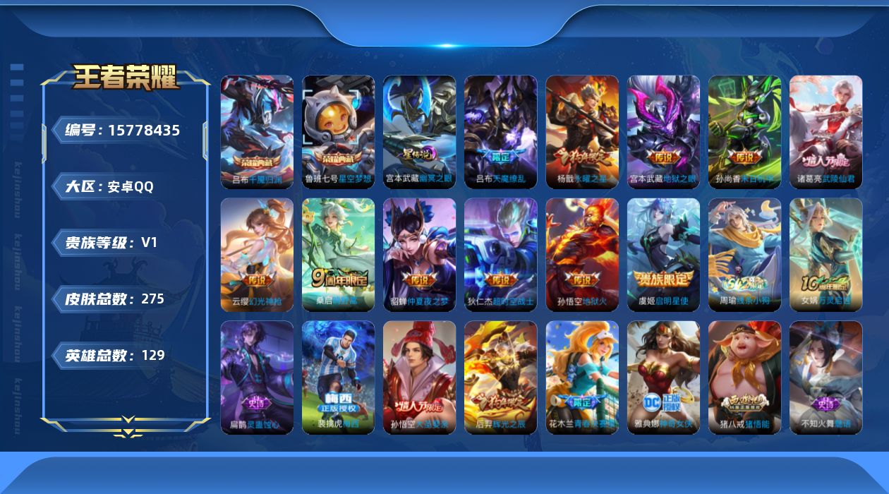 [15778435]安卓Q275皮肤-2典藏皮肤-1典藏英雄-12传说-63史诗 【荣耀典藏】:武则天英雄,鲁班七号星空梦想,吕布千魇归渊 【传说皮肤】:后羿神树通天,云缨幻光神枪,桑启鸣野蒿,虞姬启明星使,杨戬永曜之星,诸葛亮武陵仙君,貂蝉仲夏夜之梦,孙尚香末日机甲,宫本武藏地狱之眼,孙悟空地狱火,吕布天魔缭乱,狄仁杰超时空战士 【限定皮肤】:姜子牙天穹之誓,狄仁杰阴阳师,赵云皇家上将,嬴政优雅恋人,嬴政白昼王子,鲁班七号狮舞东方,庄周云端筑梦师,庄周高山流水,钟无艳王者之锤,芈月重明,吕布天魔缭乱,吕布猎兽之王,夏侯惇朔风刀,曹操烛龙,典韦穷奇,狄仁杰魔术师,狄仁杰万华元夜,达摩沙漠行僧,项羽海滩派对,项羽霸王别姬,老夫子醍醐杖,貂蝉逐梦之音,程咬金演武夺筹,韩信逐梦之影,兰陵王金庭之子,花木兰青春决赛季,孙悟空大圣娶亲,牛魔御旌,后羿辉光之辰,李元芳银河之约,李元芳云中旅人,虞姬霸王别姬,虞姬启明星使,钟馗神迹守卫,钟馗驱傩正仪,杨戬永曜之星,干将莫邪胡桃夹子,雅典娜黎明之约,鬼谷子原初探秘者,诸葛亮武陵仙君,苏烈千军破阵,弈星混沌棋,沈梦溪星空之诺,沈梦溪大漠名商,明世隐疑决卦,裴擒虎李小龙,裴擒虎擒涛扼浪,狂铁御狮,米莱狄御霄,盾山御銮,猪八戒猪悟能,上官婉儿梁祝,鲁班大师探海日志,桑启海盐诗旅,阿古朵江河有灵,张良古海寻踪,裴擒虎梅西,鬼谷子天穹祈灯,沈梦溪龙舞盛年,刘邦剑破天穹 【年限皮肤】:杨戬永曜之星,后羿辉光之辰 【赛季限定】:芈月重明,夏侯惇朔风刀,曹操烛龙,典韦穷奇,狄仁杰万华元夜,达摩沙漠行僧,老夫子醍醐杖,程咬金演武夺筹,兰陵王金庭之子,张良古海寻踪,牛魔御旌,李元芳云中旅人,钟馗驱傩正仪,雅典娜黎明之约,鬼谷子原初探秘者,苏烈千军破阵,弈星混沌棋,沈梦溪大漠名商,明世隐疑决卦,裴擒虎擒涛扼浪,狂铁御狮,米莱狄御霄,盾山御銮,鲁班大师探海日志,桑启海盐诗旅,鬼谷子天穹祈灯,刘邦剑破天穹,姜子牙天穹之誓 【战令限定】:嬴政白昼王子,鲁班七号狮舞东方,吕布猎兽之王,李元芳银河之约,钟馗神迹守卫,沈梦溪星空之诺 【史诗皮肤】:鲁班七号电玩小子,项羽苍穹之光,露娜紫霞仙子,阿轲暗夜猫娘,钟无艳王者之锤,赵云皇家上将,赵云未来纪元,貂蝉圣诞恋歌,甄姬冰雪圆舞曲,狄仁杰魔术师,廉颇地狱岩魂,宫本武藏鬼剑武藏,孙尚香水果甜心,嬴政优雅恋人,嬴政暗夜贵公子,妲己魅力维加斯