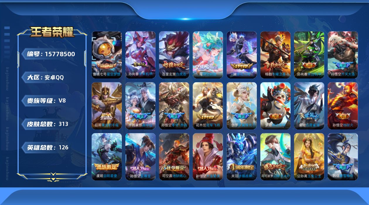 - [11911927]V8 1典藏 1无双 1珍品传说 23传说 125英雄 355皮肤 可修改实名 优质装备:全息碎影(猴子典藏),器灵·螭龙剑,怪盗基德,云鹰飞将(小将军),绛天战甲(鸡嘴战神),炽阳神光,一念神魔,地狱火,仲夏夜之梦(大飞蛾),零号·赤焰,地狱之眼,时之恋人-刘备(电焊工),挚爱之约,无双飞将,山海·苍雷引(电光曜子),燃星之曲,澜逐花归海 传说皮:乘龙·淬吴钩(孙策年限),祥瑞亨通,幻光神枪 珍宝阁皮:优雅恋人,蔷薇恋人,玩趣恶龙 限定皮:愿照·岁时盈(虞姬年限),愿照·千秋盛(女娲年限),逐霄战戟,鸣野蒿,至尊宝,傲雪梅枪,白晶晶,神威(电光马子),遇见飞天,高山流水,诗剑行,齐天大圣,五谷丰年,梁祝,烈魂,天狼征服者,李小龙,如梦令-后羿,孙行者,猪悟能,冰霜恋舞曲,美猴王 史诗皮:鸭鸭历险记-刘禅,化蝶舞,灵蛊蚀心,星界战将,龙之律动,茶境仙,怒海争锋,蒙犽顽岩魄,超元猎域,百相守梦-百里守约,百相守梦-黄忠,紫霞仙子,电玩小子(小书包),黄金分割率,特工魅影,千年之狐,江河有灵,雪夜绮愿(周瑜),真我赫兹(百里守约),百解令(蒙犽),高渐离燃音魔法,蒙恬荣光圣徽,无限星赏官,偶像歌手,电玩·爆裂旋风,暗夜猫娘,末日机甲-吕布,猫狗日记-孙策,猫狗日记-大乔,时之恋人-孙尚香,乱世虎臣,节奏热浪,修罗,女仆咖啡,摇滚巨星,水果甜心,绅士熊喵,天才门将,星夜王子,心灵骇客,功夫厨神,德古拉伯爵,暗隐猎兽者,幽灵船长,鬼剑武藏,心灵战警,舞动绿茵,地狱岩魂,纤云弄巧,繁星吟游(呼啦呼啦),拒霜思,缤纷独角兽,乘风破浪,逐浪之夏,月团寄思,水晶猎龙者,曙光守护者,箭羽风息,金属风暴,原初追逐者,圣诞狂欢,圣诞恋歌,鹰眼统帅,王者之锤,暗夜贵公子,魅力维加斯,黎明之约,无心,未来纪元-赵云