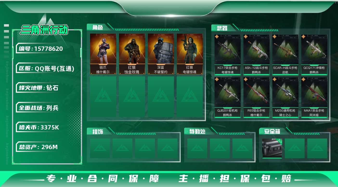 [15778620]【店主推荐捡漏号!可直接换绑】3375k哈伏币-265m流动资产-60烽火等级-钻石-12战场等级-列兵 【干员外观】:红狼-蚀金玫瑰,骇爪-维什戴尔,深蓝-不破誓约,红狼-电锯惊魂 【近战皮肤】:近战-黑鹰 【传说外观】:M4A1突击步枪-蚀金玫瑰,M4A1突击步枪-阿米娅,ASh-12战斗步枪-鹅鸭杀,SCAR-H战斗步枪-启航,KC17突击步枪-电锯惊魂,QCQ171冲锋枪-鹅鸭杀,M250通用机枪-骑士之心,QJB201轻机枪-鹅鸭杀,R93狙击步枪-维什戴尔 【史诗外观】:ASh-12战斗步枪-无极限,腾龙突击步枪-猎鳄行动,K437突击步枪-守护者,MP5冲锋枪-战术竞备,MP5冲锋枪-竞技风,SR-3M紧凑突击步枪-战术竞备,勇士冲锋枪-深海恐惧,勇士冲锋枪-工业狂潮,MP7冲锋枪-守护者,PKM通用机枪-蝮蛇,M250通用机枪-囚徒,Mini-14射手步枪-守护者,M700狙击步枪-蝮蛇,M700狙击步枪-哈夫克警备,AWM狙击步枪-无极限,复合弓-守护者 【稀有外观】:AKM突击步枪-战术演练,AKM突击步枪-肃杀,QBZ95-1突击步枪-公平竞技,M7战斗步枪-捣蛋鬼,SCAR-H战斗步枪-荣耀列队,SCAR-H战斗步枪-黄昏,G3战斗步枪-战术演练,G3战斗步枪-主宰,腾龙突击步枪-冰天雪地,MP5冲锋枪-弄臣,MP5冲锋枪-哈夫克卫队,P90冲锋枪-黄昏,P90冲锋枪-捣蛋鬼,Vector冲锋枪-先锋,UZI冲锋枪-亚特兰蒂斯,SMG-45-行动开启,SMG-45冲锋枪-幻影结构,勇士冲锋枪-冰天雪地,M1014霰弹枪-幻影结构,S12K霰弹枪-战术演练,QJB201轻机枪-黄昏,QJB201轻机枪-哈夫克卫队,Mini-14射手步枪-荣耀列队,SKS射手步枪-弄臣,SR-25射手步枪-开拓,SV-98狙击步枪-星链科技,SV-98狙击步枪-哈夫克航天,SV-98狙击步枪-精英联盟,G18-星链科技,G18-哈夫克航天 【普通外观】:M4A1突击步枪-粉色涂装,M4A1突击步枪-高雅黑,M4A1突击步枪-海色,QBZ95-1突击步枪-高雅黑,QBZ95-1突击步枪-海浪,QBZ95-1突击步枪-三角洲力量,QBZ95-1突击步枪-海色,QBZ191突击步枪-三角洲力量,K416突击步枪-几何迷彩,M16A4突击步枪-高雅黑,AUG突击步枪