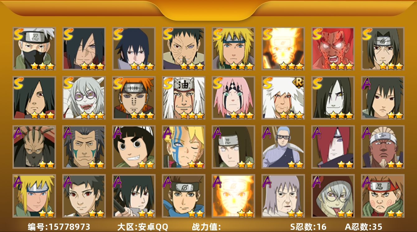 【S级忍者】:宇智波斑「秽土转生·解」(3星),春野樱「忍界大战」(3星),宇智波带土「忍界大战」(3星),宇智波鼬「须佐能乎」(3星),旗木卡卡西「须佐能乎」(3星),自来也(3星),自来也「舞之豪杰」(3星),大蛇丸(3星),自来也「传说中的三忍」(3星),宇智波斑(3星),波风水门(3星),药师兜「仙人模式」(3星),漩涡鸣人「九喇嘛连结」(3星),迈特凯「死门」(3星),佩恩「天道」(3星),宇智波佐助「永恒万花筒」(3星)