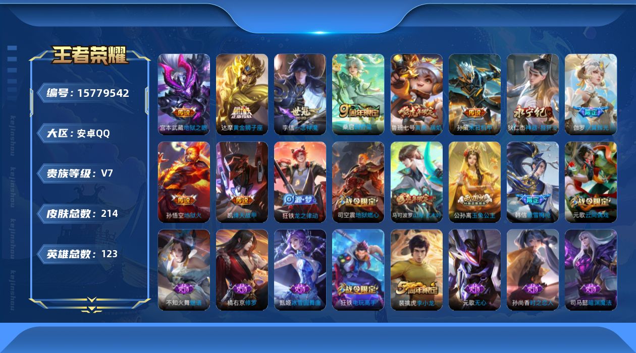 [15779542]安卓Q-V7-最强王者段位-123英雄-214皮肤-0典藏-0珍品无双-0无双-0珍品传说-10传说-56史诗