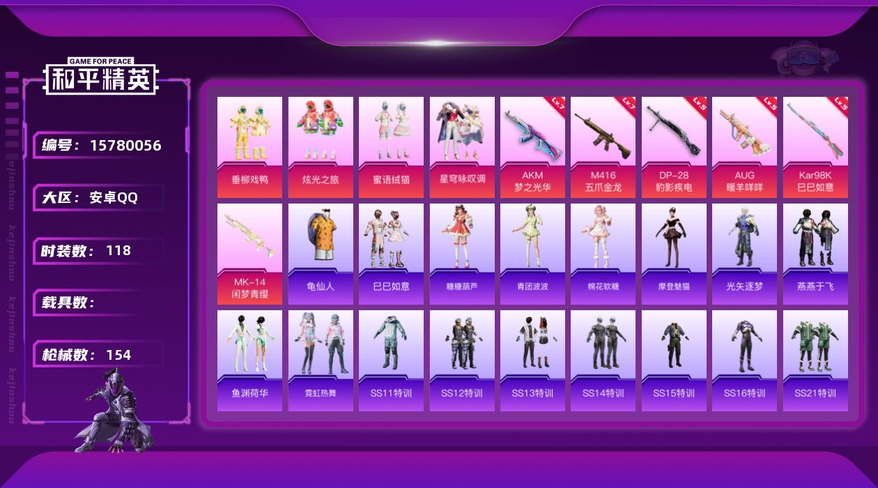 [15780056]安卓 手Q-4粉装-6特效枪-0载具-0粉色飞行器-48774热力值-11王牌印记-118套装-154枪皮 【热门品类】:套装-龟仙人 【粉色套装】:粉装-垂柳戏鸭,粉装-炫光之旅,粉装-蜜语绒猫,粉装-星穹咏叹调 【粉色枪皮等级】:AKM-梦之光华(七级),M416-五爪金龙(七级),AUG-暖羊咩咩(五级),Kar98K-巳巳如意(五级),DP-28-豹影疾电(五级) 【粉色枪皮】:AKM-梦之光华,M416-五爪金龙,AUG-暖羊咩咩,Kar98K-巳巳如意,Mk14-闲梦青缨,DP-28-豹影疾电 【粉色降落伞】:金风玉露降落伞,香水柠檬降落伞,暗夜玫瑰降落伞,恐龙拽拽降落伞,环太平洋降落伞,垂柳戏鸭降落伞,旋转彩虹降落伞,天星战神降落伞,未来歌姬降落伞,闲梦青缨降落伞,萌物绒绒降落伞,江南烟雨降落伞,创世·救赎降落伞,千金淑猫降落伞 【稀有套装】:套装-龟仙人,套装-巳巳如意,套装-糖糖葫芦,套装-青团波波,套装-棉花软糖,角色-摩登魅猫,角色-光矢逐梦,套装-燕燕于飞,套装-鱼渊荷华,套装-霓虹热舞 【稀有枪皮】:AKM-夜灯,AKM-破晓战魂,AKM-萌趣颜团子,AKM-龙的传人,M16A4-幻世战舞者,M16A4-千金淑猫,SCAR-L-玉兔迎春,SCAR-L-红色方程式,SCAR-L-黄金龙骨,M416-糯团青竹,M416-红色方程式,M416-绯红前夜,GROZA-2B战斗服款,GROZA-恐龙拽拽,GROZA-懵萌河马,AUG-耀粉歌者,QBZ-未来歌姬,M762-彩虹甜喵,M762-牛气冲天,G36C-懵萌河马,G36C-金风玉露,AC-VAL-天降萌叽,AC-VAL-快闪甜心,蜜獾-天降萌叽,蜜獾-娇憨猪猪,UZI-啾咪啾咪,UZI-天降萌叽,UZI-娇憨猪猪,UZI-金风玉露,UZI-月影灵韵,UMP45-时空追击者,UMP45-生命誓言,UMP45-蓝色火焰,Vector-焰鹰斗篷,Vector-彩虹符号,Vector-田园牧歌,汤姆逊-天降萌叽,汤姆逊-炫彩节奏,汤姆逊-耀粉歌者,野牛-夜灯,AKS-74U-鬼刀,P90-快闪甜心,P90-飞驰魅影,P90-巳巳如意,Kar98K-彩虹符号,AWM-焰鹰斗篷,AWM-垂柳戏鸭,SKS-未来歌姬,SKS-炫彩节奏,VSS-彩虹符号,Mini14-涂山之恋,Mini14-炫彩节奏,SLR