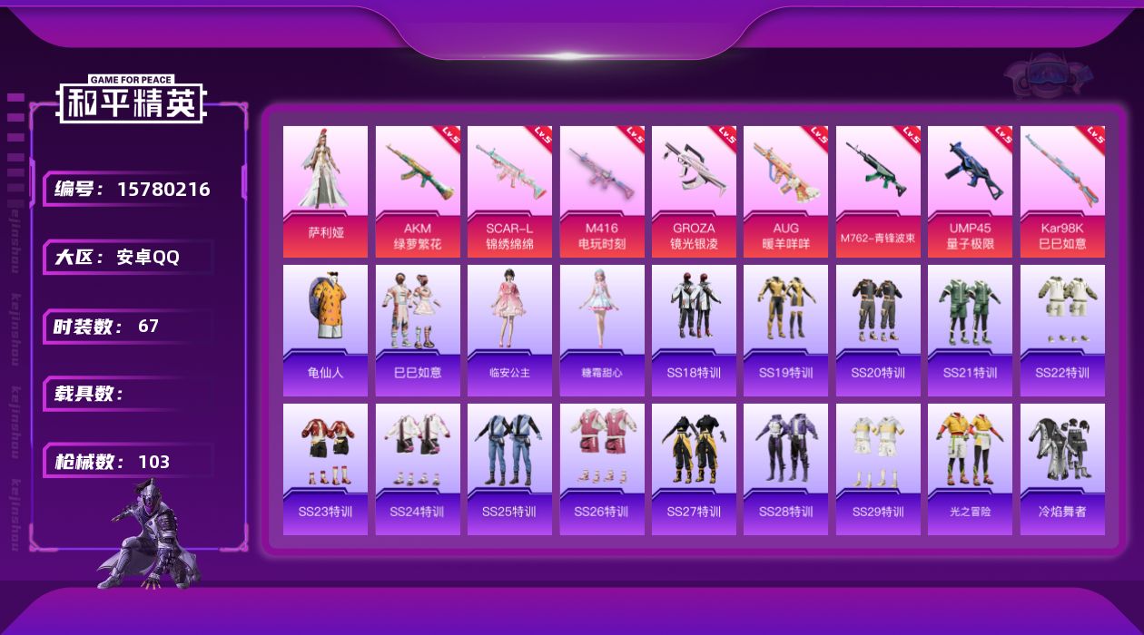 [15780216]安卓 手Q-1粉装-8特效枪-28774热力值-11王牌印记-67套装-103枪皮