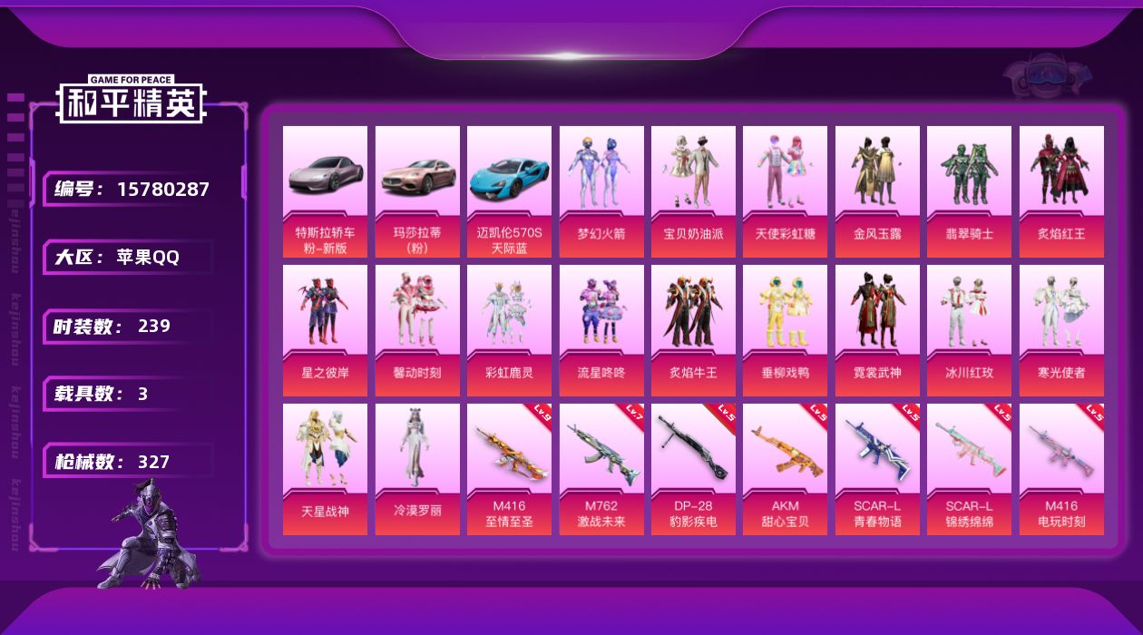 [15780287]苹果 手Q-17粉装-16特效枪-3载具-1粉色飞行器-113824热力值-13王牌印记-239套装-327枪皮