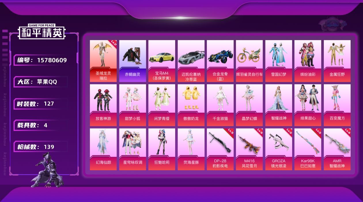 [15780609]苹果 手Q-无敌战神框-1神装-16粉装-12特效枪-4载具-7粉色飞行器-57162热力值-6王牌印记-127套装-139枪皮 【红色神装等级】:圣域龙灵-瑞拉(二级) 【红色角色神装】:圣域龙灵-瑞拉 【热门品类】:粉装-雪国幻梦,粉装-缤纷油彩,套装-赤蝎幽灵,角色-Mark.06 【粉色载具】:宝马M4(圣保罗黄),迈凯伦塞纳(冷萃蓝),合金龙骨(蓝),僚机-圣域龙宝,辉羽雀灵自行车 【粉色套装】:粉装-雪国幻梦,粉装-金属狂野,粉装-缤纷油彩,粉装-放客神游,粉装-甜梦小狐,粉装-闲梦青缨,粉装-傲傲奶龙,角色-千金淑猫,角色-晶梦幻蝶,角色-智耀战神,粉装-绯果甜心,粉装-百变魔方,角色-幻海仙踪,粉装-星穹咏叹调,角色-狂魅哈莉,角色-荧海星豚 【粉色枪皮等级】:AKM-炫紫旋律(二级),SCAR-L-青春物语(三级),M416-风花雪月(五级),GROZA-镜光银凌(五级),AKS-74U-星穹咏叹调(二级),Kar98K-巳巳如意(五级),Kar98K-圣域龙灵(二级),AMR-智耀战神(四级),DP-28-豹影疾电(五级),MG3-辉羽雀灵(三级),破片手榴弹-瓶中星球(四级) 【粉色枪皮】:AKM-炫紫旋律,SCAR-L-青春物语,M416-风花雪月,GROZA-镜光银凌,AKS-74U-星穹咏叹调,Kar98K-巳巳如意,Kar98K-圣域龙灵,Mk14-闲梦青缨,AMR-智耀战神,DP-28-豹影疾电,MG3-辉羽雀灵,破片手榴弹-瓶中星球 【粉色飞行器】:酣梦熊熊飞行器,彩虹独角兽飞行器,圣域金龙飞行器,绯果甜心飞行器,百变魔方飞行器,雀灵庇佑飞行器 【粉色降落伞】:甜梦小狐降落伞,闲梦青缨降落伞,圣堂之誓降落伞,未来领航者降落伞,千金淑猫降落伞,晶梦幻蝶降落伞,彩虹独角兽降落伞,樱桃泡泡降落伞,戏水时光降落伞,圣域龙灵降落伞,智耀战神降落伞,绯果甜心降落伞,百变魔方降落伞,幻海仙踪降落伞,星穹咏叹调降落伞,幻彩电音降落伞,绯穹魔姬降落伞 【稀有套装】:套装-航行童话,套装-摩登天骄,套装-绒宝小鹅,套装-巳巳如意,套装-小鸟芋圆,套装-乐游熊熊,套装-雏菊兔兔,套装-萝兰蝴蝶,套装-小熊娃娃,套装-先驱飞行员,套装-糖糖葫芦,套装-青团波波,套装-燕燕于飞,套装-鱼渊荷华,玩偶服-小狗蛇点点,套装-晶灵使者,套装-晶辉守护,角色-蜜桃