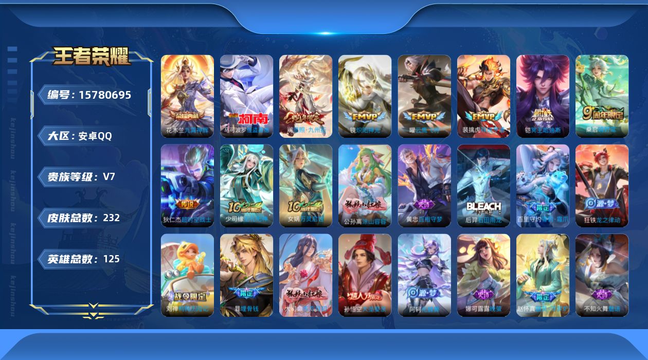 [15780695]安卓Q-V7-最强王者段位-125英雄-232皮肤-1典藏皮肤-1珍品传说-8传说-60史诗