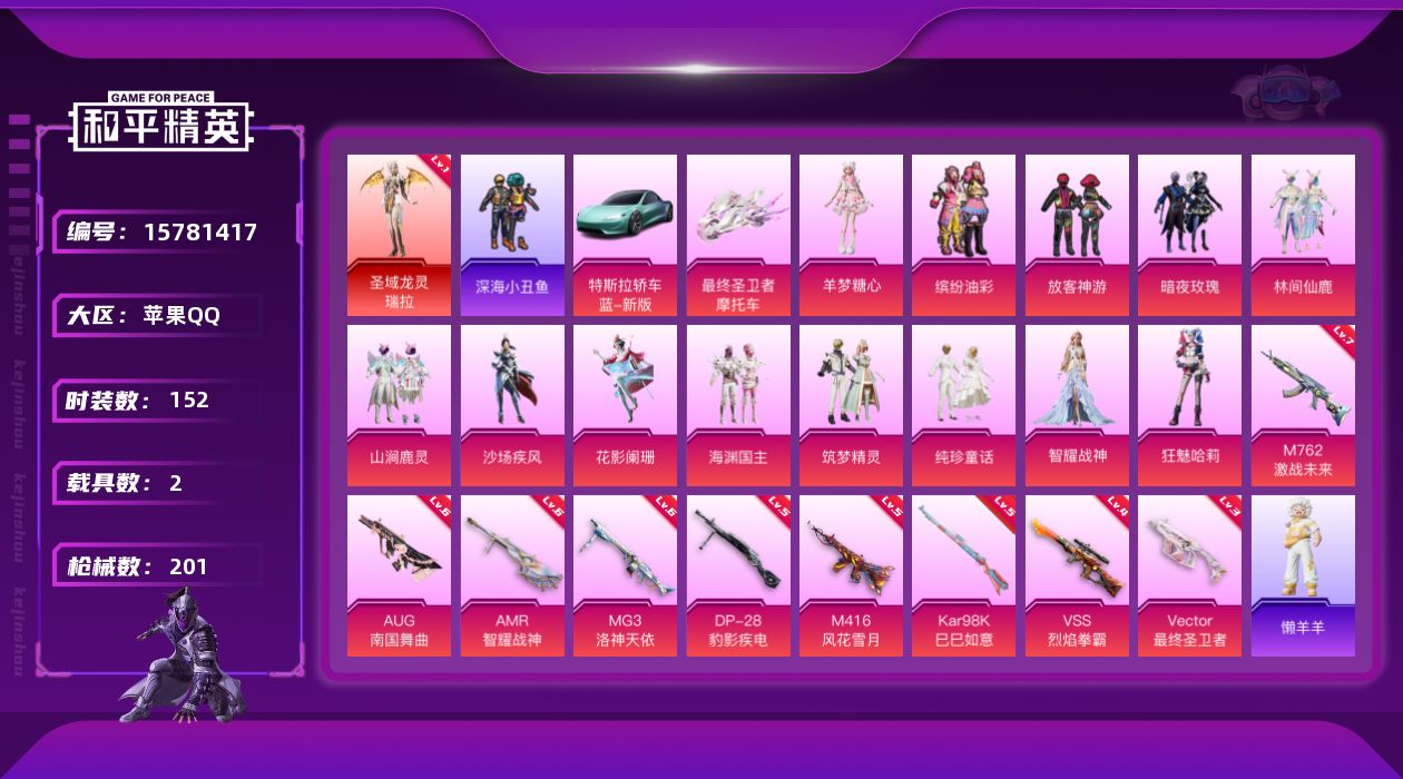 [15781417]苹果 手Q-1神装-13粉装-9特效枪-2载具-3粉色飞行器-69919热力值-10王牌印记-152套装-201枪皮 【红色神装等级】:圣域龙灵-瑞拉(一级) 【红色角色神装】:圣域龙灵-瑞拉 【热门品类】:粉装-缤纷油彩,套装-深海小丑鱼,套装-小丑鱼,套装-粉红小猪 【粉色载具】:特斯拉Roadster(水滴蓝),最终圣卫者摩托车 【粉色套装】:粉装-缤纷油彩,粉装-放客神游,粉装-暗夜玫瑰,粉装-林间仙鹿,粉装-山涧鹿灵,粉装-沙场疾风,粉装-花影阑珊,粉装-海渊国主,粉装-筑梦精灵,粉装-纯珍童话,角色-智耀战神,角色-狂魅哈莉,角色-羊梦糖心 【粉色枪皮等级】:M416-风花雪月(五级),AUG-南国舞曲(六级),M762-激战未来(七级),Vector-最终圣卫者(三级),Kar98K-巳巳如意(五级),VSS-烈焰拳霸(四级),AMR-智耀战神(六级),DP-28-豹影疾电(五级),MG3-洛神天依(六级) 【粉色枪皮】:M416-风花雪月,AUG-南国舞曲,M762-激战未来,Vector-最终圣卫者,Kar98K-巳巳如意,VSS-烈焰拳霸,AMR-智耀战神,DP-28-豹影疾电,MG3-洛神天依 【粉色飞行器】:圣域金龙飞行器,雀灵庇佑飞行器,终晖之翼飞行器 【粉色降落伞】:梦幻火箭降落伞,夏日绵绵冰降落伞,暗夜玫瑰降落伞,林间仙鹿降落伞,洛神天依降落伞,环太平洋降落伞,彩虹甜喵降落伞,南国舞曲降落伞,圣域龙灵降落伞,智耀战神降落伞,星穹咏叹调降落伞,幻彩电音降落伞,双重狂想降落伞,喜羊羊与灰太狼降落伞,异瞳寒姬降落伞 【稀有套装】:套装-绒宝小鹅,套装-巳巳如意,套装-小鸟芋圆,套装-燕燕于飞,套装-鱼渊荷华,套装-晶灵使者,套装-晶辉守护,套装-粉恋花,套装-紫幽梦,套装-蓝冰羽,套装-星渊小夜曲,套装-霓虹热舞,套装-极速光影,套装-云朵鹅,套装-雪绒豹,套装-诡诞巡游,套装-混沌火种,玩偶服-懒羊羊 【稀有枪皮】:AKM-夜灯,AKM-彩虹符号,AKM-影袭,AKM-玉龙,AKM-破晓战魂,AKM-缤纷海域,AKM-萌趣颜团子,AKM-虎虎生威,AKM-霓虹街区,AKM-龙的传人,M16A4-幻世战舞者,M16A4-甜心亚梦,M16A4-红色方程式,M16A4-最终圣卫者,SCAR-L-暗夜玫瑰,SCAR-L-炫彩节奏,SCAR-L-玉
