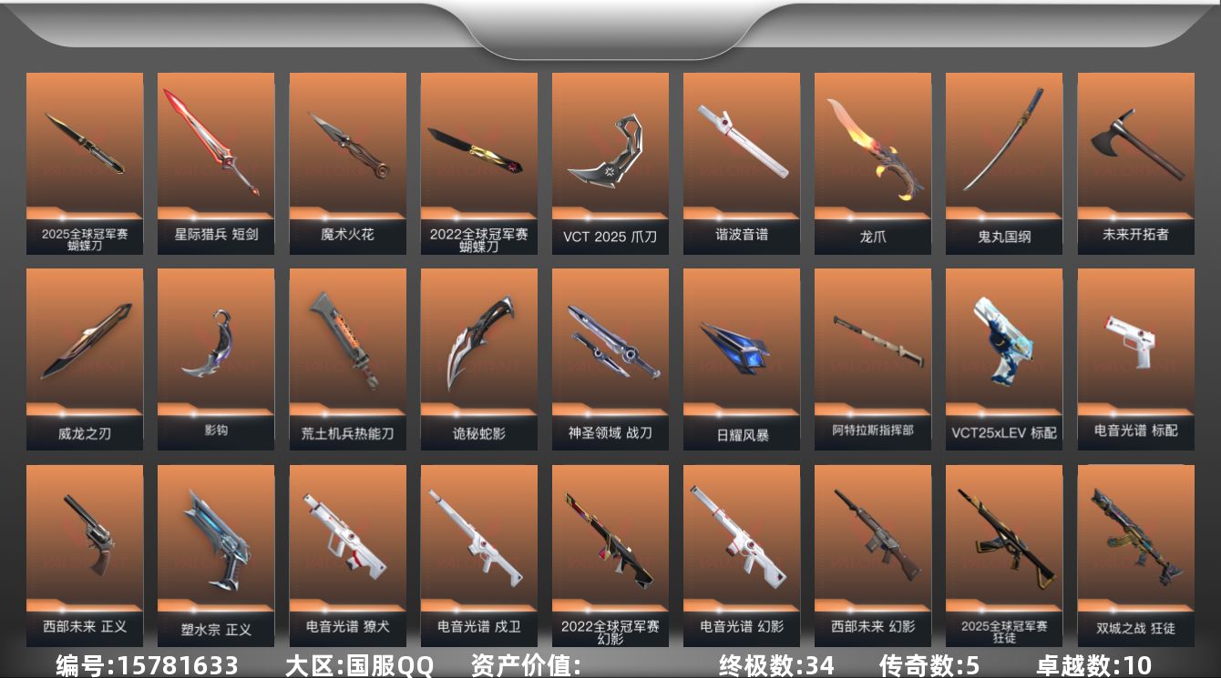 [15781633]可二次【店主推荐捡漏号!可直接换绑】【套装】:2025全球冠军赛套装,2022全球冠军赛套装,上古龙炎套装,电音光谱套装,VCT 2025 赛季套装,西部未来套装,般若假面//2.0套装 【英雄】:幻棱,炼狱,维斯,暮蝶,钛狐,壹决,铁臂,捷风,雷兹,幽影,不死鸟,贤者,猎枭,蝰蛇,零,芮娜,奇乐,尚勃勒,霓虹,斯凯,夜露,星礈,K/O,海神,盖可,黑梦,钢锁 【近战 武器】:近战武器-2025全球冠军赛 蝴蝶刀,近战武器-2022全球冠军赛 蝴蝶刀,近战武器-魔术火花,近战武器-影钩,近战武器-谐波音谱,近战武器-VCT 2025 爪刀,近战武器-威龙之刃,近战武器-鬼丸国纲,近战武器-未来开拓者,近战武器-龙爪,近战武器-荒土机兵 热能刀,近战武器-诡秘蛇影 军刀,近战武器-神圣领域 战刀,近战武器-日耀风暴 遗器,近战武器-阿特拉斯指挥部 甩棍,近战武器-星际猎兵 短剑,近战武器-魔术火花 【狂徒】:狂徒-上古龙炎,狂徒-2025全球冠军赛,狂徒-洪荒怒焰,狂徒-混沌序曲,狂徒-双城之战,狂徒-塑水宗,狂徒-光荣异象,狂徒-般若假面//2.0,狂徒-掠影,狂徒-盖亚的复仇,狂徒-紫阙金琅,狂徒-荒土机兵,狂徒-诡秘蛇影 【幻影】:幻影-2022全球冠军赛,幻影-西部未来,幻影-电音光谱,幻影-侦察力量,幻影-神圣领域,幻影-纳米打击,幻影-末日之翼,幻影-西部未来,幻影-电音光谱 【戍卫】:戍卫-电音光谱,戍卫-逆冲蛮牛,戍卫-月球哨兵,戍卫-折光棱晶,戍卫-电音光谱 【獠犬】:獠犬-电音光谱,獠犬-般若假面//2.0,獠犬-日冕雄师,獠犬-神圣领域,獠犬-逆冲蛮牛,獠犬-电音光谱 【冥驹】:冥驹-上古龙炎,冥驹-荒土机兵,冥驹-星云暗涌 【飞将】:飞将-西部未来,飞将-末日之翼 【莽侠】:莽侠-诡秘蛇影,莽侠-月球哨兵 【战神】:战神-般若假面//2.0,战神-离子武器//2.0,战神-神圣领域 【奥丁】:奥丁-西部未来,奥丁-纳米打击,奥丁-末日之翼 【判官】:判官-上古龙炎,判官-诡秘蛇影,判官-纳米打击x 【雄鹿】:雄鹿-逆冲蛮牛,雄鹿-月球哨兵 【骇灵】:骇灵-荒土机兵,骇灵-无限竞技,骇灵-星云暗涌 【蜂刺】:蜂刺-星云暗涌,蜂刺-折光棱晶 【标配】:标配-电音光谱,标配-荒土机兵,标配-折光棱晶,标配-电音光谱 【VCT手枪】:标配-VCT25