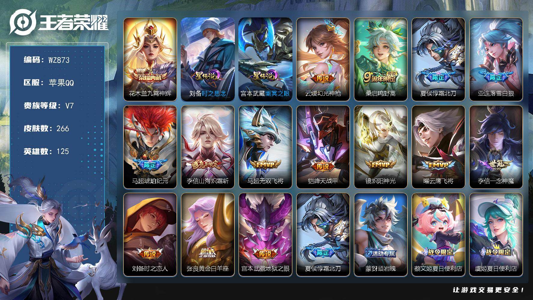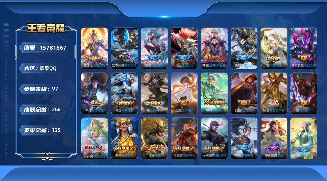 [15781667]苹果Q-266皮肤-1典藏皮肤-14传说-72史诗 【英雄全皮】:李信全皮,马超全皮 【荣耀典藏】:花木兰九霄神辉 【传说皮肤】:云缨幻光神枪,桑启鸣野蒿,夏侯惇霜北刀,亚连落雪白狼,马超琥珀纪元,李信山海炽霜斩,马超无双飞将,铠绛天战甲,镜炽阳神光,曜云鹰飞将,李信一念神魔,刘备时之恋人,张良黄金白羊座,宫本武藏地狱之眼 【限定皮肤】:夏侯惇霜北刀,蒙犽顽岩魄,蔡文姬夏日便利店,虞姬夏日便利店,姜子牙天穹之誓,杨戬破阵退雄兵,狄仁杰阴阳师,赵云皇家上将,高渐离玩趣恶龙,钟无艳超时空战士,扁鹊奇幻香踪,芈月幻夜卜梦,吕布猎兽之王,元歌无心,甄姬落雪兰心,典韦蓝屏警告,马可波罗暗影游猎,狄仁杰魔术师,达摩沙漠行僧,项羽海滩派对,老夫子航海奇遇记,韩信傲雪梅枪,王昭君午后时光,兰陵王金庭之子,李元芳云中旅人,杨戬潮玩骑兵,雅典娜黎明之约,蔡文姬繁星吟游,鬼谷子五谷丰年,黄忠火炮绅士,梦奇顽趣,沈梦溪大漠名商,裴擒虎擒涛扼浪,狂铁电玩高手,云中君纤云弄巧,李信山海炽霜斩,上官婉儿梁祝,嫦娥拒霜思,嫦娥暖冬兔眠,西施玲珑珍味,鲁班大师探海日志,桑启海盐诗旅,暃星界游侠,戈娅驭风魔法,艾琳流音漫舞,司空震地狱燃心,阿古朵江河有灵,张良古海寻踪,蒙恬荣光圣徽,高渐离燃音魔法,妲己灵卜魔法,鬼谷子天穹祈灯,伽罗琥珀纪元,马超琥珀纪元,亚连落雪白狼,沈梦溪龙舞盛年,鲁班七号蔬乡物语,李元芳蔬乡物语,刘邦剑破天穹,程咬金群星魔术团,镜青焰无极,项羽苍威无极,刘备异域游侠,周瑜熔金海岸 【年限皮肤】:马超神威,李信山海炽霜斩 【赛季限定】:达摩沙漠行僧,兰陵王金庭之子,张良古海寻踪,李元芳云中旅人,雅典娜黎明之约,梦奇顽趣,沈梦溪大漠名商,裴擒虎擒涛扼浪,鲁班大师探海日志,桑启海盐诗旅,鬼谷子天穹祈灯,蒙恬荣光圣徽,刘邦剑破天穹,姜子牙天穹之誓 【战令限定】:蔡文姬夏日便利店,虞姬夏日便利店,钟无艳超时空战士,扁鹊奇幻香踪,芈月幻夜卜梦,吕布猎兽之王,甄姬落雪兰心,典韦蓝屏警告,马可波罗暗影游猎,老夫子航海奇遇记,王昭君午后时光,艾琳流音漫舞,杨戬潮玩骑兵,黄忠火炮绅士,狂铁电玩高手,嫦娥暖冬兔眠,西施玲珑珍味,司空震地狱燃心,暃星界游侠,戈娅驭风魔法,高渐离燃音魔法,妲己灵卜魔法,鲁班七号蔬乡物语,李元芳蔬乡物语,镜青焰无极,项羽苍威无极 【史诗皮肤】:露娜紫霞仙子,赵云皇家上将,
