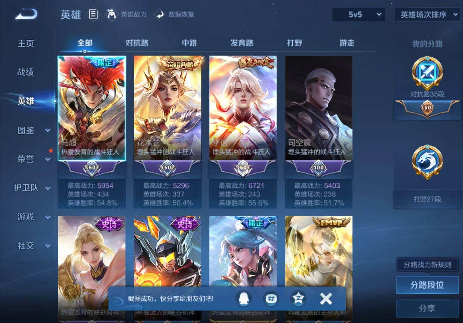 - [11608146]V7 6传说 123英雄 223皮肤 可修改实名 优质装备:一念神魔,地狱火,时之恋人-刘备(电焊工),超时空战士-狄仁杰 珍宝阁皮:妄想食味,玩趣恶龙 限定皮:鸣野蒿,至尊宝,魔法小厨娘,时雨天司(水龙头),飞衡(韩信年限),高山流水,五谷丰年,梁祝,天狼绘梦者,李小龙,大圣娶亲,冰霜恋舞曲 史诗皮:紫霞仙子,电玩小子(小书包),黄金分割率,特工魅影,江河有灵,无限星赏官,偶像歌手,末日机甲-吕布,猫狗日记-孙策,猫狗日记-大乔,乱世虎臣,节奏热浪,修罗,女仆咖啡,水果甜心,绅士熊喵,天才门将,星夜王子,心灵骇客,功夫厨神,德古拉伯爵,暗隐猎兽者,幽灵船长,鬼剑武藏,暗渊魔法,心灵战警,地狱岩魂,纤云弄巧,缤纷独角兽,乘风破浪,逐浪之夏,水晶猎龙者,曙光守护者,箭羽风息,金属风暴,圣诞狂欢,圣诞恋歌,鹰眼统帅,魅力维加斯,未来纪元-赵云