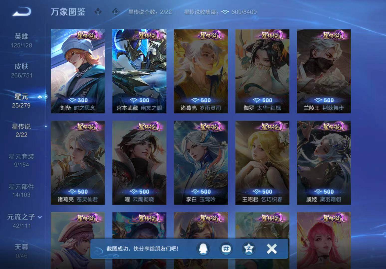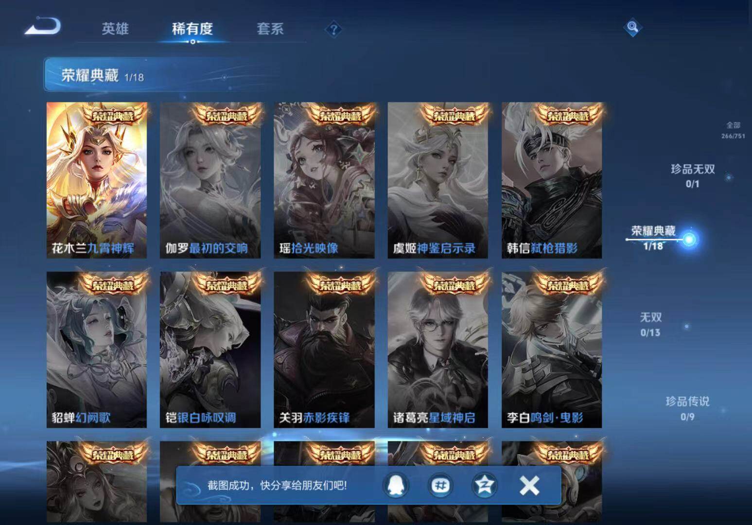 - [15777832]按键10 安卓Q-293皮肤-1典藏皮肤-1珍品传说-13传说-83史诗 【英雄全皮】:影全皮 【荣耀典藏】:韩信弑枪猎影 【珍品传说】:孙策时之奇旅 【传说皮肤】:后羿神树通天,澜愿照九州拓,云缨幻光神枪,桑启鸣野蒿,孙尚香乘龙问璇玑,马可波罗妄想实况,公孙离记忆之芯,孙悟空齐天大圣,镜炽阳神光,李信一念神魔,虞姬云霓雀翎,后羿黄金射手座,宫本武藏地狱之眼 【限定皮肤】:暃埋骨钱,蔡文姬夏日便利店,虞姬夏日便利店,姜子牙天穹之誓,李白谪仙醉月,狄仁杰阴阳师,赵云皇家上将,高渐离玩趣恶龙,钟无艳超时空战士,吕布猎兽之王,元歌云间偶戏,元歌无心,甄姬落雪兰心,马可波罗山海玄木吟,马可波罗妄想实况,狄仁杰魔术师,达摩沙漠行僧,项羽海滩派对,程咬金演武夺筹,韩信飞衡,韩信傲雪梅枪,兰陵王金庭之子,孙悟空至尊宝,孙悟空大圣娶亲,孙悟空孙行者,孙悟空齐天大圣,李元芳云中旅人,钟馗驱傩正仪,女娲朔望之晖,干将莫邪胡桃夹子,鬼谷子五谷丰年,苏烈千军破阵,百里玄策原初追逐者,梦奇顽趣,沈梦溪大漠名商,裴擒虎李小龙,裴擒虎擒涛扼浪,云中君纤云弄巧,猪八戒西部大镖客,上官婉儿梁祝,嫦娥拒霜思,嫦娥暖冬兔眠,鲁班大师探海日志,桑启海盐诗旅,暃星界游侠,艾琳流音漫舞,司空震地狱燃心,阿古朵江河有灵,张良古海寻踪,蒙犽百解令,蒙恬荣光圣徽,高渐离燃音魔法,妲己灵卜魔法,鬼谷子天穹祈灯,伽罗琥珀纪元,姬小满妄想食味,安琪拉乘龙聚宝船,孙尚香乘龙问璇玑,沈梦溪龙舞盛年,鲁班七号蔬乡物语,李元芳蔬乡物语,刘邦剑破天穹,程咬金群星魔术团,周瑜熔金海岸 【年限皮肤】:韩信飞衡,马可波罗山海玄木吟,安琪拉乘龙聚宝船,孙尚香乘龙问璇玑 【赛季限定】:达摩沙漠行僧,程咬金演武夺筹,兰陵王金庭之子,张良古海寻踪,李元芳云中旅人,钟馗驱傩正仪,苏烈千军破阵,百里玄策原初追逐者,梦奇顽趣,沈梦溪大漠名商,裴擒虎擒涛扼浪,鲁班大师探海日志,桑启海盐诗旅,鬼谷子天穹祈灯,蒙恬荣光圣徽,刘邦剑破天穹,姜子牙天穹之誓 【战令限定】:蔡文姬夏日便利店,虞姬夏日便利店,钟无艳超时空战士,吕布猎兽之王,元歌云间偶戏,甄姬落雪兰心,艾琳流音漫舞,女娲朔望之晖,猪八戒西部大镖客,嫦娥暖冬兔眠,司空震地狱燃心,暃星界游侠,高渐离燃音魔法,妲己灵卜魔法,鲁班七号蔬乡物语,李元芳蔬乡物语 【史诗皮肤】:项羽苍穹之光,露娜紫霞仙子,赵云