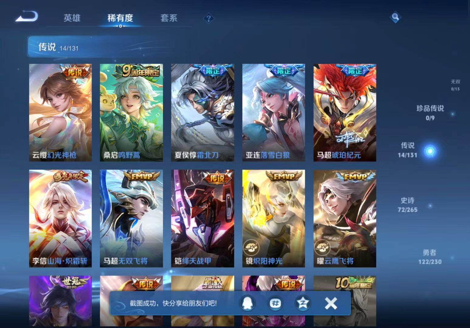 【传说皮肤】:云缨幻光神枪,桑启鸣野蒿,夏侯惇霜北刀,亚连落雪白狼,马超琥珀纪元,李信山海炽霜斩,马超无双飞将,铠绛天战甲,镜炽阳神光,曜云鹰飞将,李信一念神魔,刘备时之恋人,张良黄金白羊座,宫本武藏地狱之眼