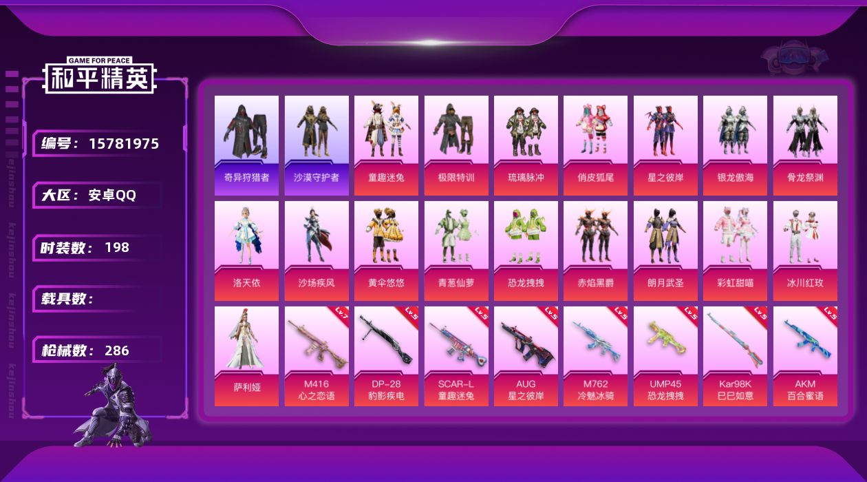 [15781975]安卓 手Q-17粉装-13特效枪-5粉色飞行器-95494热力值-11王牌印记-198套装-286枪皮 【热门品类】:粉装-童趣迷兔,套装-奇异狩猎者,套装-金羽特工,套装-沙漠守护者,套装-粉红小猪 【粉色套装】:粉装-极限特训,粉装-琉璃脉冲,粉装-俏皮狐尾,粉装-童趣迷兔,粉装-星之彼岸,粉装-银龙傲海,粉装-骨龙祭渊,角色-洛天依,粉装-沙场疾风,粉装-黄伞悠悠,粉装-青葱仙萝,粉装-恐龙拽拽,粉装-赤焰黑爵,粉装-朗月武圣,粉装-彩虹甜喵,粉装-冰川红玫,角色-萨利娅 【粉色枪皮等级】:AKM-百合蜜语(五级),SCAR-L-童趣迷兔(五级),M416-心之恋语(七级),M416-风花雪月(二级),AUG-星之彼岸(五级),M762-冷魅冰骑(五级),UMP45-恐龙拽拽(五级),Kar98K-绿意幻情(四级),Kar98K-巳巳如意(五级),AWM-焰龙焚天(四级),M249-蓝莓炮弹(二级),M249-彩虹甜喵(四级),DP-28-豹影疾电(五级) 【粉色枪皮】:AKM-百合蜜语,SCAR-L-童趣迷兔,M416-心之恋语,M416-风花雪月,AUG-星之彼岸,M762-冷魅冰骑,UMP45-恐龙拽拽,Kar98K-绿意幻情,Kar98K-巳巳如意,AWM-焰龙焚天,M249-蓝莓炮弹,M249-彩虹甜喵,DP-28-豹影疾电 【粉色飞行器】:神秘黑猫飞行器,星之彼岸飞行器,齐天大圣飞行器,风花雪月飞行器,冷魅冰骑飞行器 【粉色降落伞】:极限特训降落伞,幻影战神降落伞,神秘黑猫降落伞,伏魔团降落伞,甜蜜誓约降落伞,四圣焕新降落伞,潮汐统领降落伞,锦绣火鲤降落伞,阿狸红降落伞,星之彼岸降落伞,烈焰拳霸降落伞,暗夜玫瑰降落伞,蓝莓炮弹降落伞,百合蜜语降落伞,橘柚倾心降落伞,冷魅冰骑降落伞,彩虹甜喵降落伞,飒粉甜心降落伞,守护天翼降落伞,临安公主降落伞,幻彩电音降落伞 【稀有套装】:套装-燕燕于飞,套装-鱼渊荷华,套装-旋风灵鼠,角色-夜瞳黯灵,套装-朱霞炽焰,套装-凌霄紫焰,套装-擎苍青焰 【稀有枪皮】:AKM-冰凉西瓜,AKM-四圣焕新,AKM-夜灯,AKM-奇异狩猎者,AKM-彩虹符号,AKM-恐龙拽拽,AKM-星之彼岸,AKM-沙漠守护者,AKM-灼热熔岩,AKM-玉龙,AKM-生命誓言,AKM-破晓战魂,AKM-萌趣颜团子,AKM-虎虎生威,AK