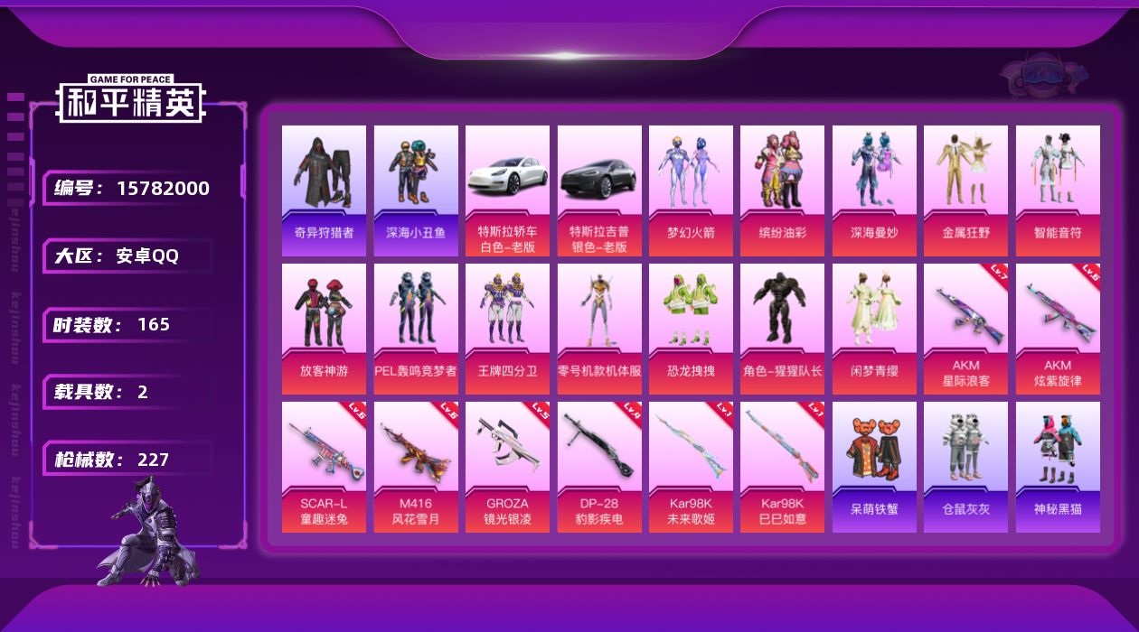 [15782000]安卓 手Q-12粉装-8特效枪-2载具-3粉色飞行器-78193热力值-13王牌印记-165套装-227枪皮 【热门品类】:粉装-梦幻火箭,粉装-缤纷油彩,套装-浪漫天命,套装-深海小丑鱼,套装-奇异狩猎者,套装-龟仙人,套装-暗影哥特 【粉色载具】:特斯拉Model 3(珍珠白),特斯拉Model X(冷光银) 【粉色套装】:粉装-深海曼妙,粉装-梦幻火箭,粉装-金属狂野,粉装-智能音符,粉装-缤纷油彩,粉装-放客神游,粉装-PEL轰鸣竞梦者,粉装-王牌四分卫,角色-零号机款机体服,粉装-恐龙拽拽,角色-猩猩队长,粉装-闲梦青缨 【粉色枪皮等级】:AKM-炫紫旋律(六级),AKM-星际浪客(七级),SCAR-L-童趣迷兔(六级),M416-风花雪月(六级),GROZA-镜光银凌(五级),Kar98K-未来歌姬(一级),Kar98K-巳巳如意(一级),DP-28-豹影疾电(四级) 【粉色枪皮】:AKM-炫紫旋律,AKM-星际浪客,SCAR-L-童趣迷兔,M416-风花雪月,GROZA-镜光银凌,Kar98K-未来歌姬,Kar98K-巳巳如意,DP-28-豹影疾电 【粉色飞行器】:深海曼妙飞行器,神秘黑猫飞行器,马卡龙飞行器 【粉色降落伞】:深海曼妙降落伞,梦幻火箭降落伞,炫紫旋律降落伞,PEL轰鸣竞梦者降落伞,神秘黑猫降落伞,甜蜜誓约降落伞,锦绣火鲤降落伞,暗夜玫瑰降落伞,蓝莓炮弹降落伞,环太平洋降落伞,暗夜鎏金降落伞,未来歌姬降落伞,江南烟雨降落伞 【稀有套装】:套装-龟仙人,角色-许七安 【稀有枪皮】:AKM-PEL轰鸣竞梦者,AKM-奇异狩猎者,AKM-彩虹符号,AKM-灼热熔岩,AKM-环太平洋,AKM-萌趣颜团子,AKM-霓虹街区,AKM-龙的传人,M16A4-红色方程式,SCAR-L-炫彩节奏,SCAR-L-玉兔迎春,SCAR-L-生命誓言,SCAR-L-银碳小老虎,SCAR-L-黄金龙骨,M416-动感兔斯基,M416-夜灯,M416-潮汐统领,M416-神秘黑猫,M416-糯团青竹,M416-红色方程式,M416-蓝色火焰,GROZA-异彩先驱,GROZA-彩虹符号,GROZA-懵萌河马,GROZA-治愈之星,GROZA-田园牧歌,GROZA-蓝莓炮弹,AUG-耀粉歌者,AUG-青春冒险家,QBZ-原初圣火,QBZ-彩虹符号,QBZ-未来歌姬,QB