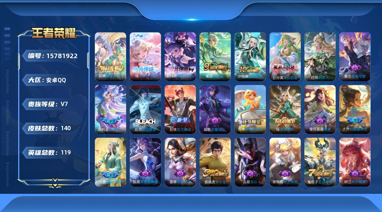[15781922]安卓Q 140皮肤-1珍品无双-2珍品传说-1传说-43史诗