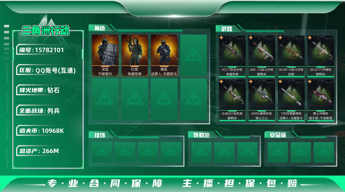 [15782101]可二次【店主推荐捡漏号!可直接换绑】 10968k哈伏币-224m流动资产-60烽火等级-钻石-18战场等级-列兵 【干员外观】:蜂医-送葬人·无题密令,深蓝-不破誓约,红狼-电锯惊魂 【近战皮肤】:近战-黑鹰 【典藏外观】:M7战斗步枪-天际线,PKM通用机枪-极地勘察队,QCQ171冲锋枪-地平线,M4A1突击步枪-雪地迷彩,.357左轮-淘金者,沙漠之鹰-蛇纹涂装,AKM突击步枪-黄铜,Mini-14射手步枪-黄铜,.357左轮-黄铜,QCQ171冲锋枪-凶兽 【传说级普通外观】:M4A1突击步枪-阿米娅,ASh-12战斗步枪-鹅鸭杀,M16A4突击步枪-狩猎时刻,AK-12突击步枪-特斯拉线圈,SCAR-H战斗步枪-启航,G3战斗步枪-狩猎时刻,CAR-15突击步枪-阿米娅,KC17突击步枪-电锯惊魂,Vector冲锋枪-狩猎时刻,UZI冲锋枪-特斯拉线圈,SR-3M紧凑突击步枪-特斯拉线圈,勇士冲锋枪-能天使-午夜邮差,QCQ171冲锋枪-鹅鸭杀,725双管霰弹枪-送葬人-无题密令,M250通用机枪-骑士之心,QJB201轻机枪-鹅鸭杀,复合弓-黑·天际线 【史诗级普通外观】:QBZ95-1突击步枪-曙光,ASh-12战斗步枪-无极限,M16A4突击步枪-竞赛选手,AUG突击步枪-蝮蛇,SCAR-H战斗步枪-囚徒,腾龙突击步枪-无垢,K437突击步枪-守护者,MP5冲锋枪-战术竞备,MP5冲锋枪-竞技风,Vector冲锋枪-阿萨拉文明,Vector冲锋枪-猎鳄行动,SR-3M紧凑突击步枪-荒野求生,SR-3M紧凑突击步枪-战术竞备,勇士冲锋枪-工业狂潮,MP7冲锋枪-无垢,MP7冲锋枪-守护者,PKM通用机枪-蝮蛇,PKM通用机枪-荒野求生,M250通用机枪-囚徒,Mini-14射手步枪-守护者,SVD狙击步枪-荒野求生,PSG-1射手步枪-无垢,SV-98狙击步枪-林中猎手,SV-98狙击步枪-囚徒,M700狙击步枪-蝮蛇,AWM狙击步枪-无极限,复合弓-守护者 【稀有级普通外观】:AKM突击步枪-战术演练,AKM突击步枪-精英联盟,AKM突击步枪-肃杀,QBZ95-1突击步枪-公平竞技,K416突击步枪-虎啸,M7战斗步枪-捣蛋鬼,SCAR-H战斗步枪-荣耀列队,SCAR-H战斗步枪-黄昏,G3战斗步枪-战术演练,G3战斗步枪-主宰,PTR-32突