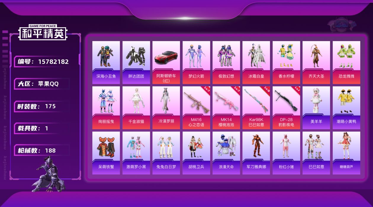 [15782182]苹果 手Q-9粉装-4特效枪-1载具-4粉色飞行器-70381热力值-8王牌印记-175套装-188枪皮